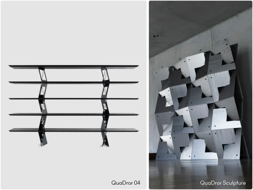 Tutti questi progetti hanno come base fondante la struttura ad esagoni riconoscibile ed unica, denominata appunto QuaDror: la materia, tagliata sapientemente e combinata assieme genera una nuova forma, un elemento strutturale nuovo che, aperto, crea una base triangolare stabile ed indipendente.