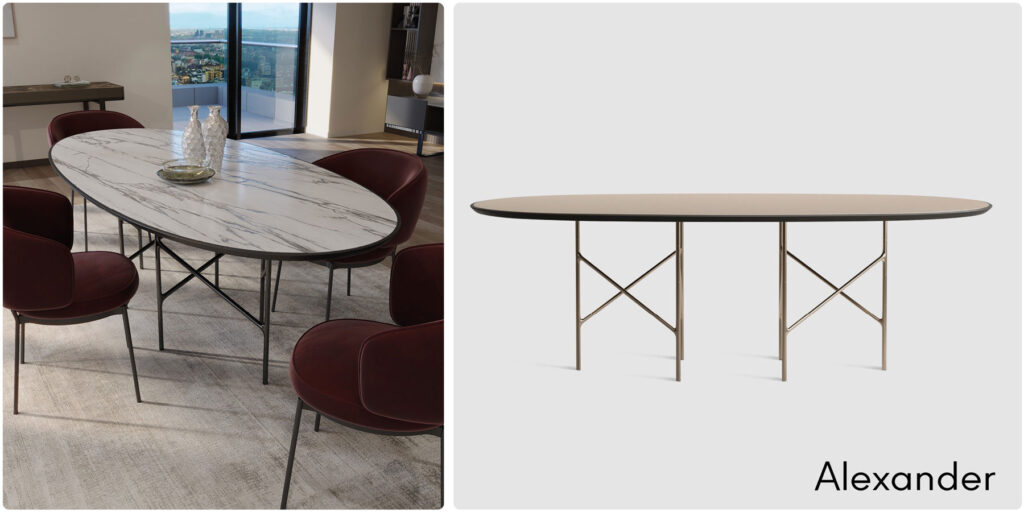 Disponibile in tre dimensioni, il tavolo Alexander offre una gamma di materiali per il piano, tra cui marmo, Fenix e vetro retroverniciato, come a voler riflettere la diversità e la ricchezza architettonica del crocevia berlinese. Questo tavolo fa parte della più ampia collezione Plaza, un progetto che mira ad reinterpretare le piazze urbane più iconiche d’Europa attraverso elementi di arredo che combinano eleganza e funzionalità.