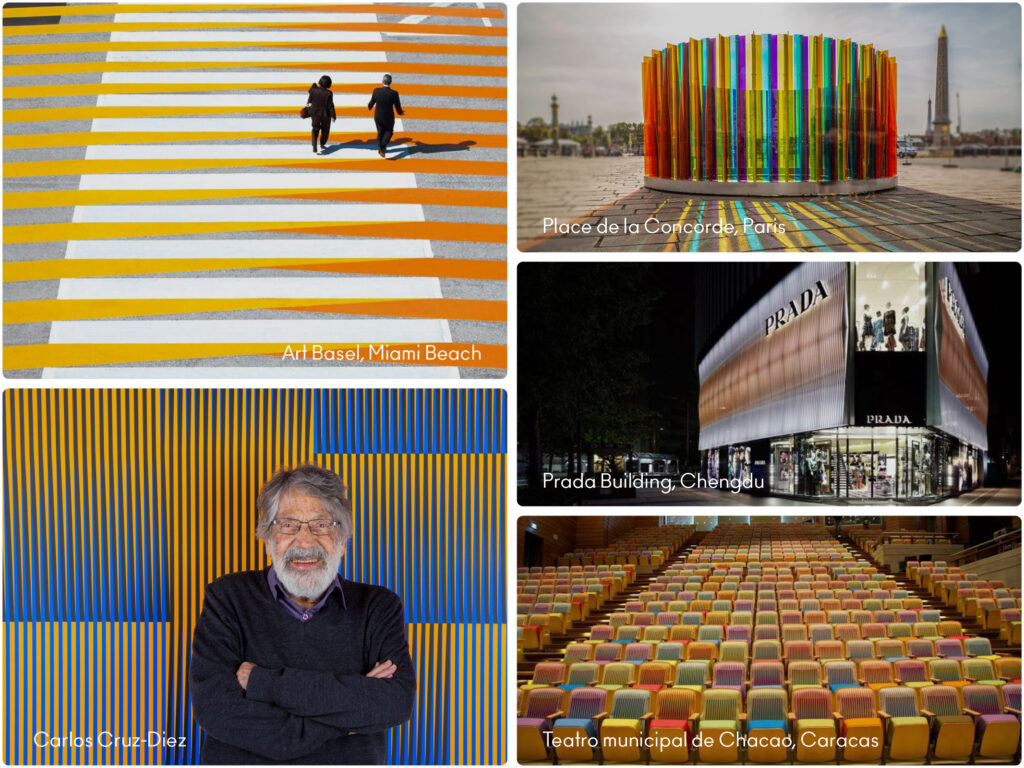 Il Maestro Cruz Diez, ha elaborato ricerche sul concetto di “colore in continua trasformazione”: applicando le leggi dell’ottica e sovrapponendo diversi piani di colore, è riuscito a realizzare nuove superfici colorate non con la pittura, ma attraverso trame di elementi ravvicinati, sollecitando esperienze sensoriali inedite.