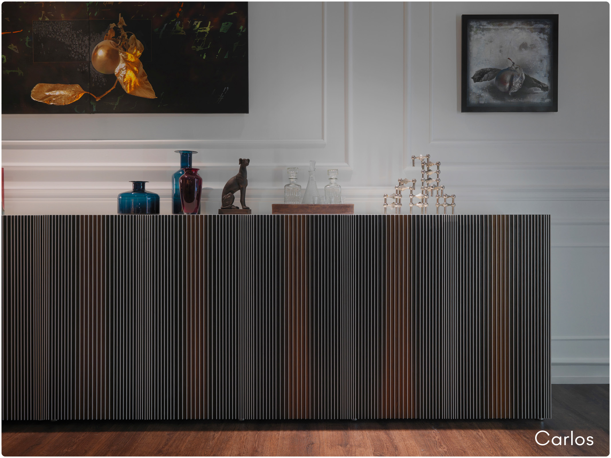Qualche anno fà, lo studio delle opere del Maestro ha portato Renato Zamberlan, designer e Product Advisor di Horm, a ideare la madia Carlos che pone l’osservatore al centro di un esperimento cinetico: non più un mero spettatore ma un vero e proprio attore che interagisce col mobile, variando il colore al variare del punto visivo, percependo l’effetto di un sipario che si apre e si chiude.
