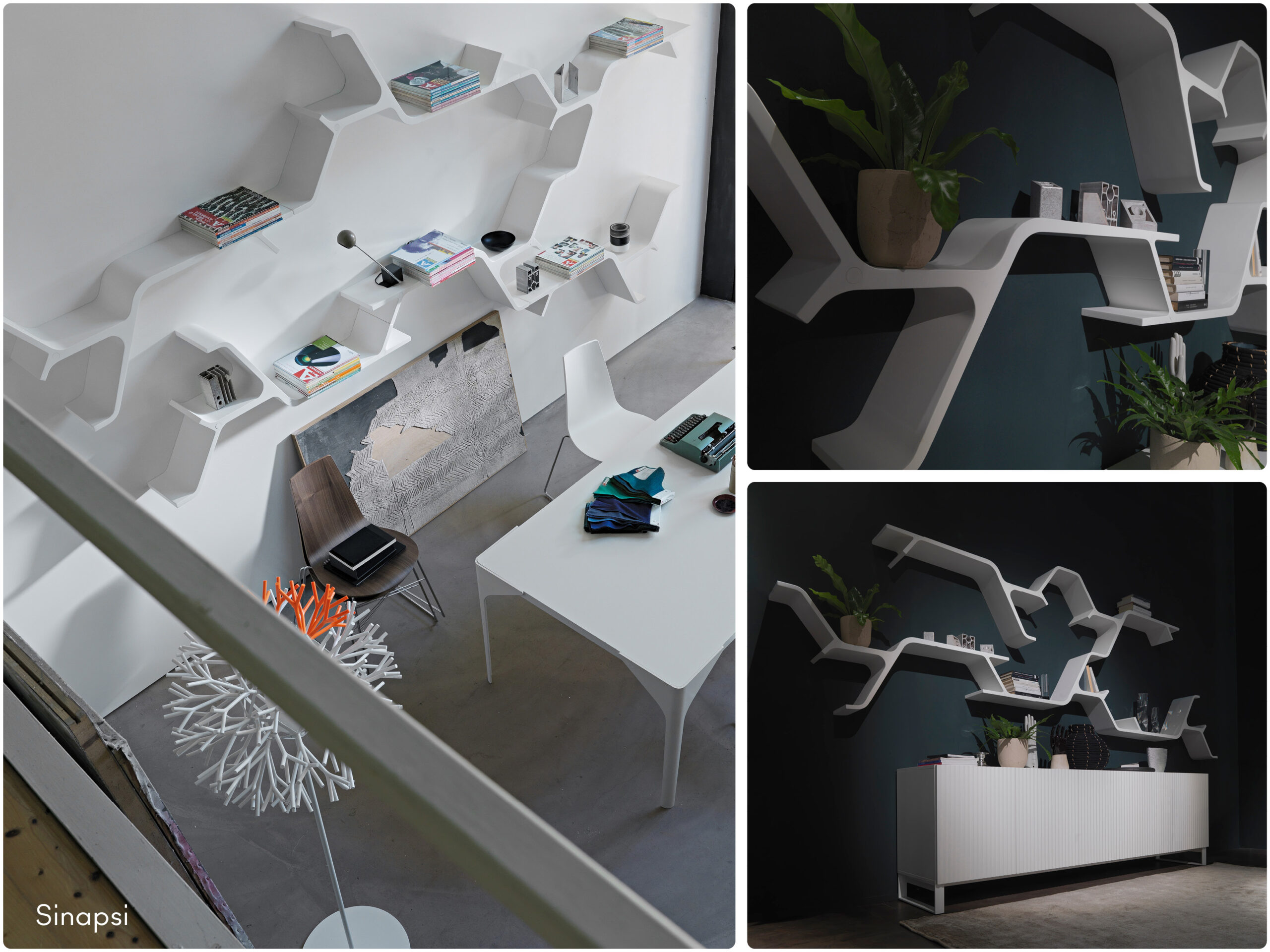 Le connessioni tra le sinapsi del cervello umano sono state la fonte di ispirazione per l’artista cileno Sebastian Errazuriz quando ha disegnato uno dei prodotti più longevi e più esclusivi di Horm: la mensola “Sinapsi”. La mensola ha un unica forma, ma affiancandone, ruotandone e specchiandone più di una è possibile realizzare infinite composizioni creando delle ampie ed eclettiche librerie a parete. E come se Sinapsi permettesse di “disegnare sulle pareti” usando un elemento d’arredo piuttosto che una matita.