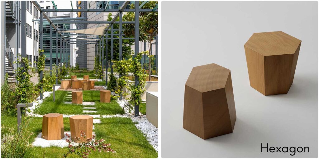 In questo contesto dove il verde è protagonista, gli sgabelli Hexagon di Horm, firmati dall’archistar Steven Holl, rappresentano il connubio perfetto tra funzionalità, design e comfort. Posizionati nel parco centrale del complesso, essi aggiungono un tocco di eleganza e raffinatezza, invitando gli occupanti a sostare e godere appieno di questo momento di relax.