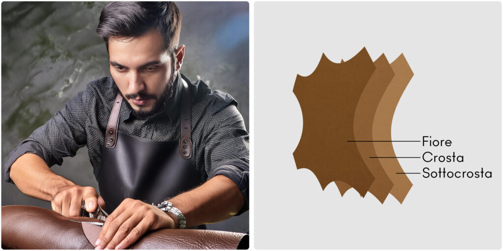 Prima della concia, la pelle spesso subisce un processo chiamato “spaccatura”. I manti di pelle, originariamente troppo spessi, vengono divisi orizzontalmente con una lama in movimento, risultando in tre strati distinti: il “fiore”, ottenuto dalla parte del pelo dell’animale, la “crosta”, ottenuta dal lato della carne, e la “sottocrosta”, che pur essendo la parte meno pregiata trova comunque molti usi pratici ed economici nella produzione di articoli in pelle.