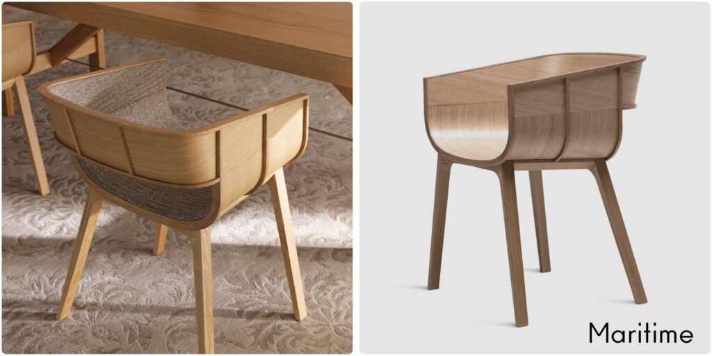 E poi c’è la sedia Maritime di Casamania, che, giocando con le venature del rovere curvato, ottiene una forma avvolgente e accogliente. Un design che richiama le linee sinuose delle onde del mare, evocando un senso di movimento e fluidità.