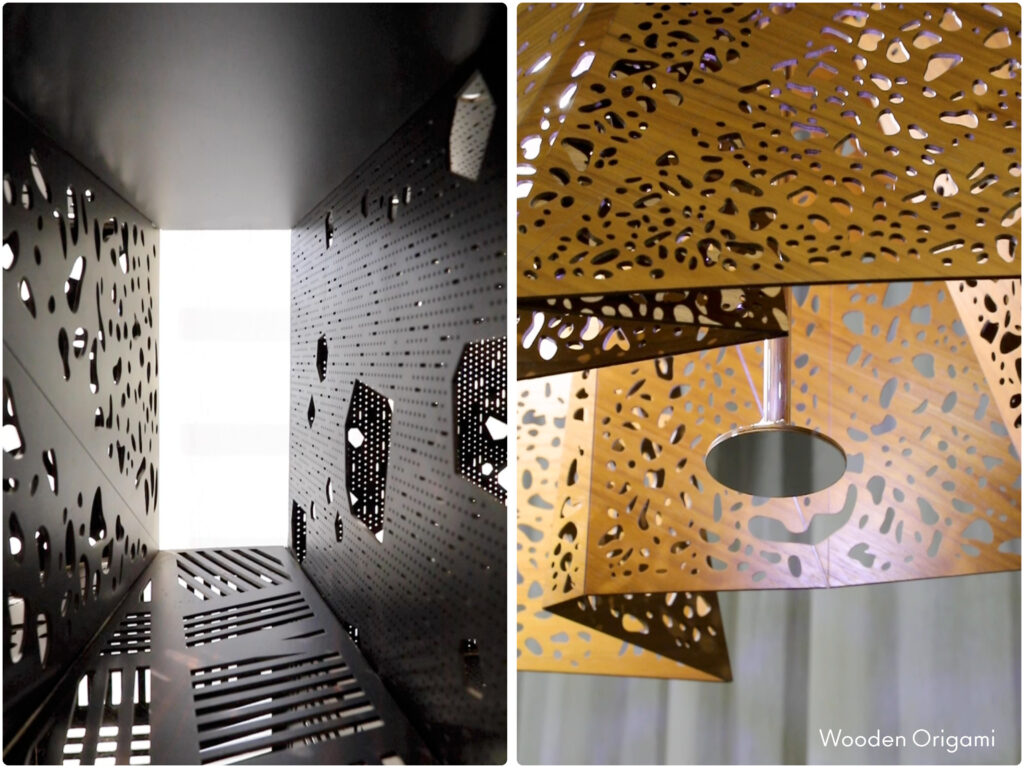 Plywood Chandelier, un lampadario dove la luce a led, filtrando attraverso i fori della struttura, riproduce nell’ambiente circostante giochi d’ombre unici.