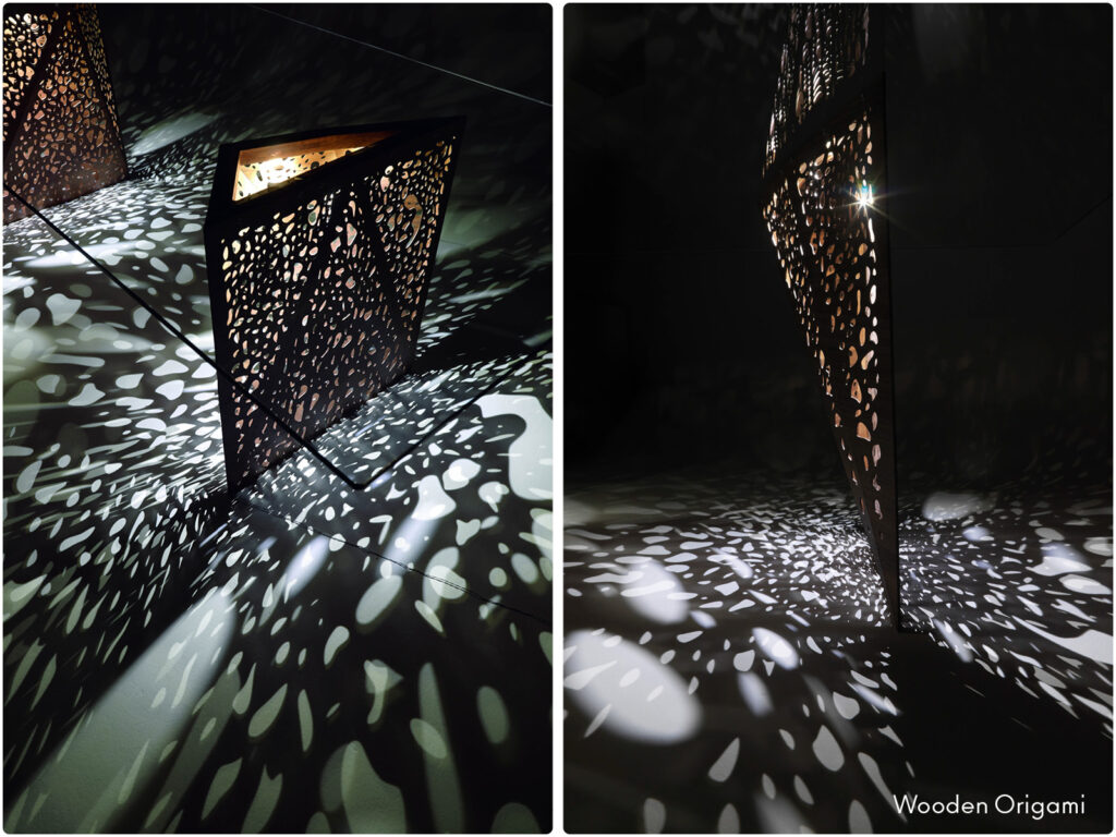 Riddled Tavolo, dove le gambe, realizzate attraverso sottilissimi fogli di legno piegati, rendono ancor più spettacolare questo progetto, che sembra una sfida alle leggi della fisica. Le due gambe, simili a scultorei origami, permettono alla luce interna di trapassarle in un’esplosione di giochi di luce e ombra.
