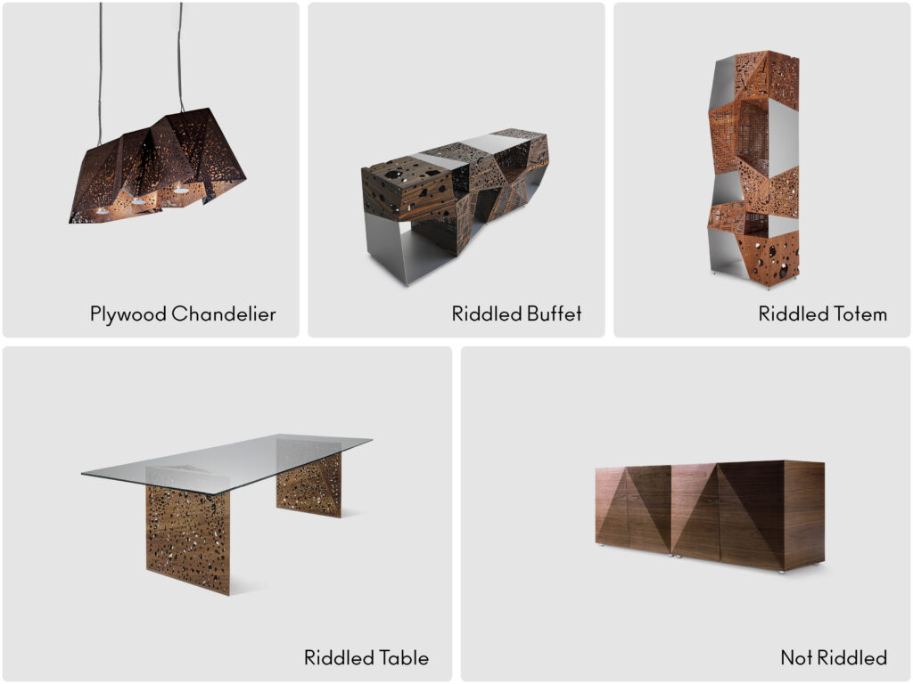 Nella collezione Riddled, disegnata da Steven Holl, tavolo, buffet e lampadario sono accomunati dall’essere realizzati attraverso sottilissimi fogli di legno origami perforati secondo un disegno decorativo progettato dall’architetto. Queste opere permettono alla luce di trapassarle in una vera e propria esplosione di giochi d’ombre che si ripercuote anche sull’ambiente circostante creando atmosfere uniche.