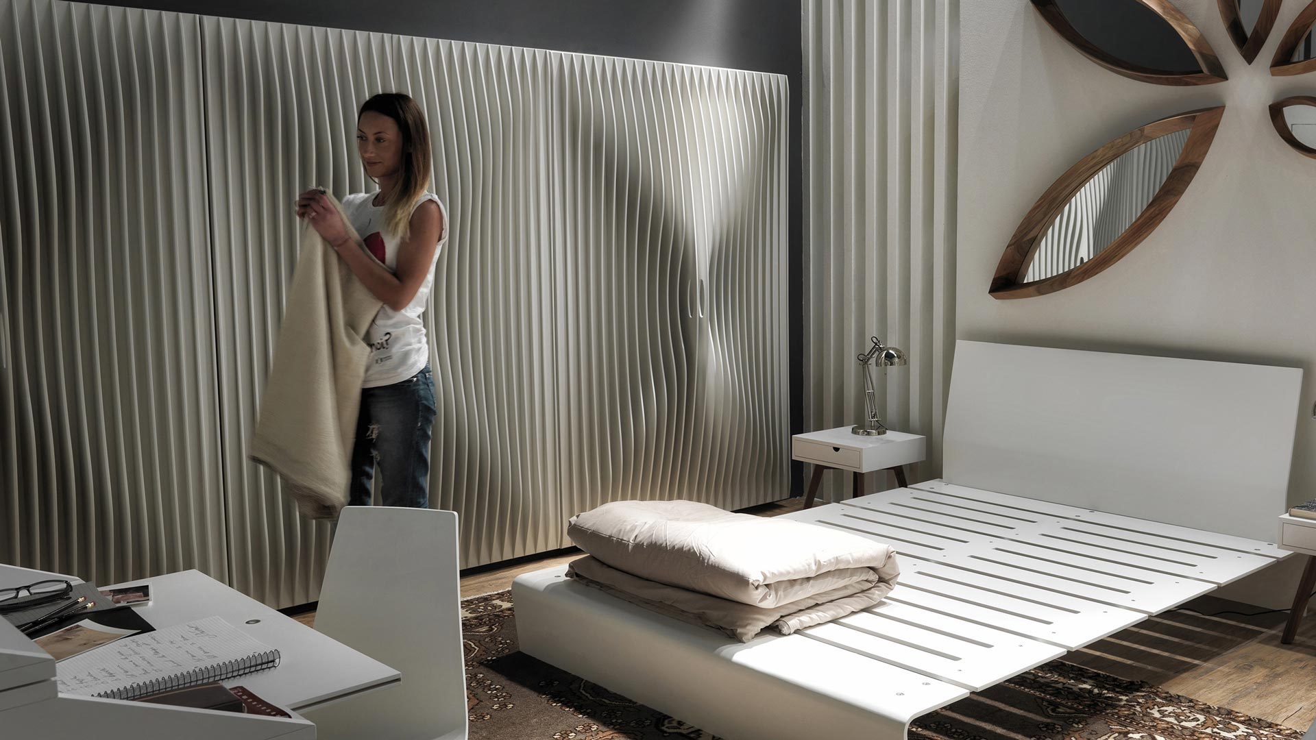 Blend è un armadio di design dalle linee dinamiche e scultoree, firmato Karim Rashid. Le ante sono composte da sottili lamine di MDF equidistanti, che creano un suggestivo effetto cinetico capace di mutare con la luce e il punto di vista dell’osservatore.
