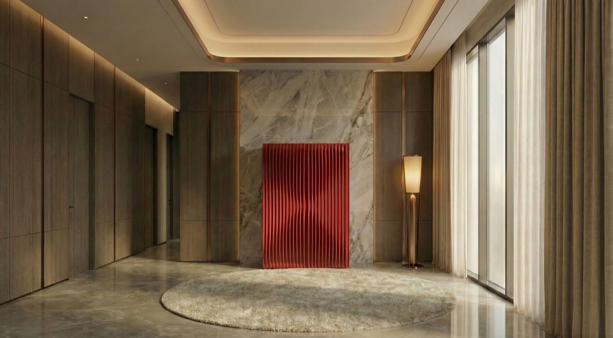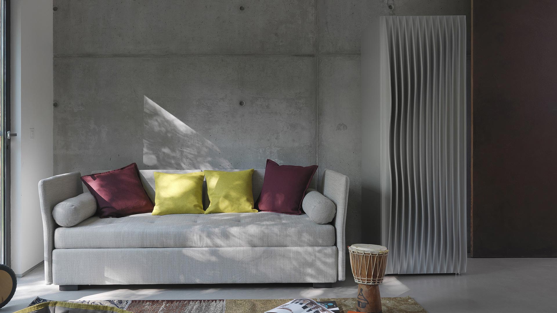 Le superfici di Blend a ripiani sembrano animate da un movimento fluido e continuo, come se la materia fosse modellata dal vento o da un’onda che si propaga nel tempo. Le lamelle verticali in MDF, scolpite con precisione e disposte a ritmo costante, generano un effetto visivo dinamico che muta con la luce e la prospettiva, restituendo un’inedita sensazione di profondità.