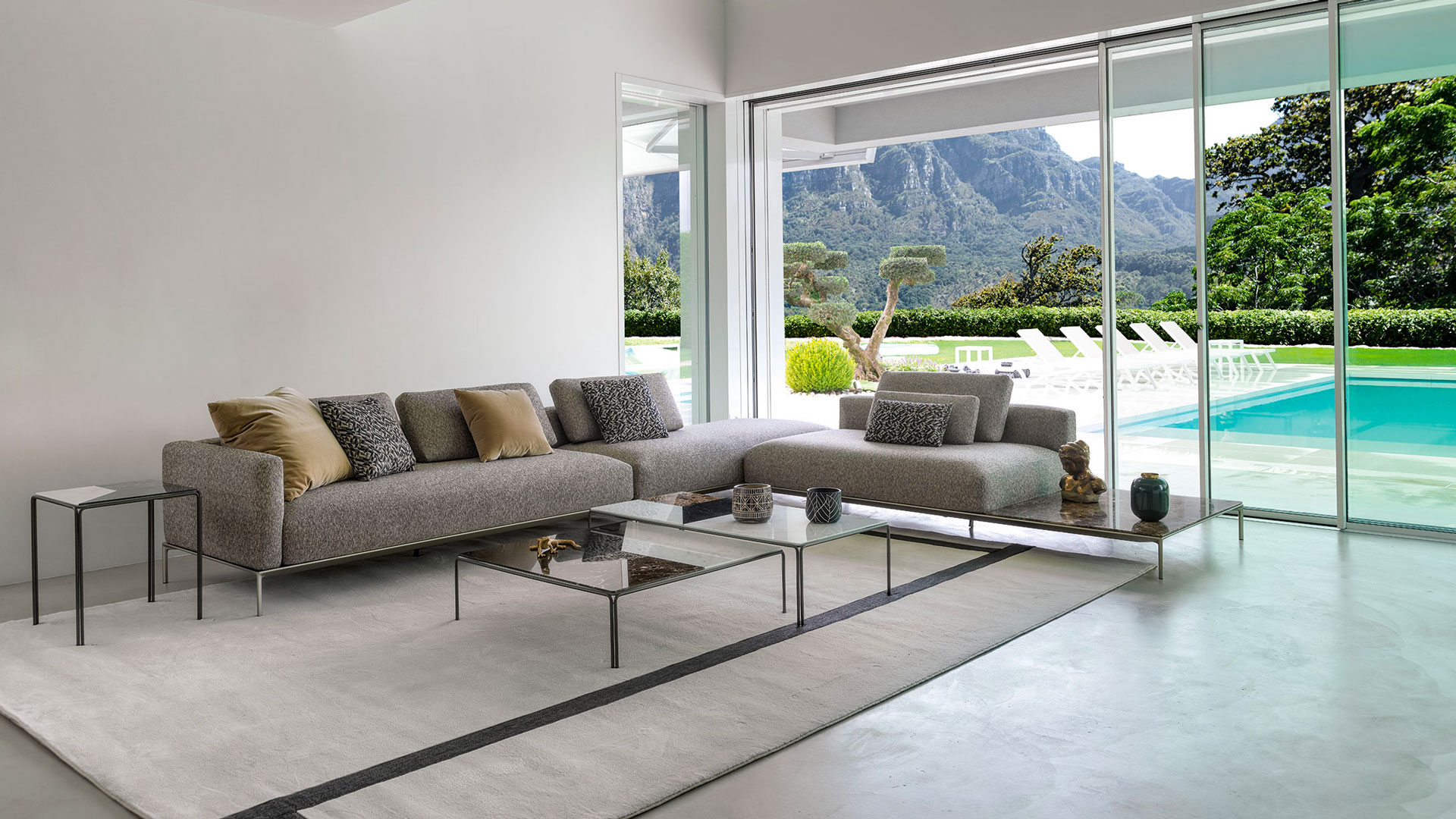Nella sua versione componibile, Dizzy si distingue per il piede alto e sottile in alluminio, che solleva la struttura da terra donando al divano un’eleganza aerea e una presenza architettonica di grande leggerezza. Alcuni moduli possono integrare un raffinato piano in marmo, sostenuto dallo stesso telaio in alluminio, che si estende oltre la seduta trasformandosi in un piano d’appoggio funzionale e scenografico.