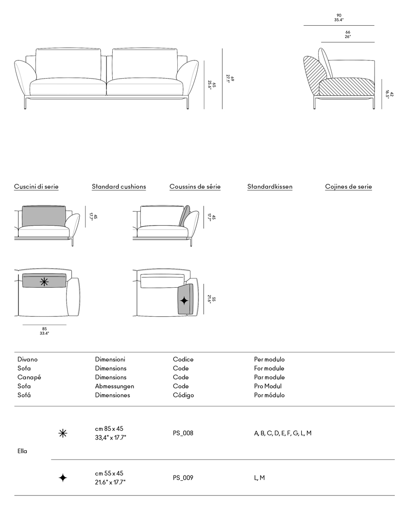 Ispirato al carisma di Ella Fitzgerald, il divano ne riflette la femminilità sofisticata e la forza espressiva: una presenza decisa ma armoniosa, capace di rendere ogni spazio più intimo e raffinato. La struttura in alluminio brevettata Horm, leggera e riciclabile, garantisce solidità e flessibilità compositiva, mentre i volumi pieni e le imbottiture soffici offrono un comfort profondo e naturale.