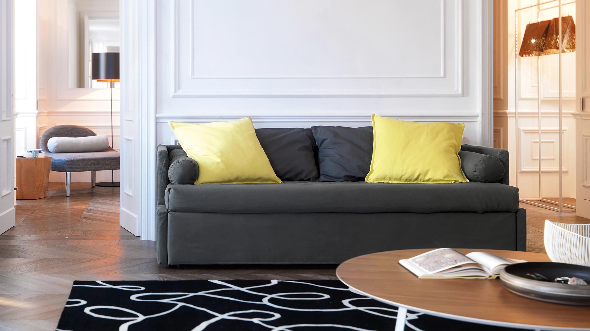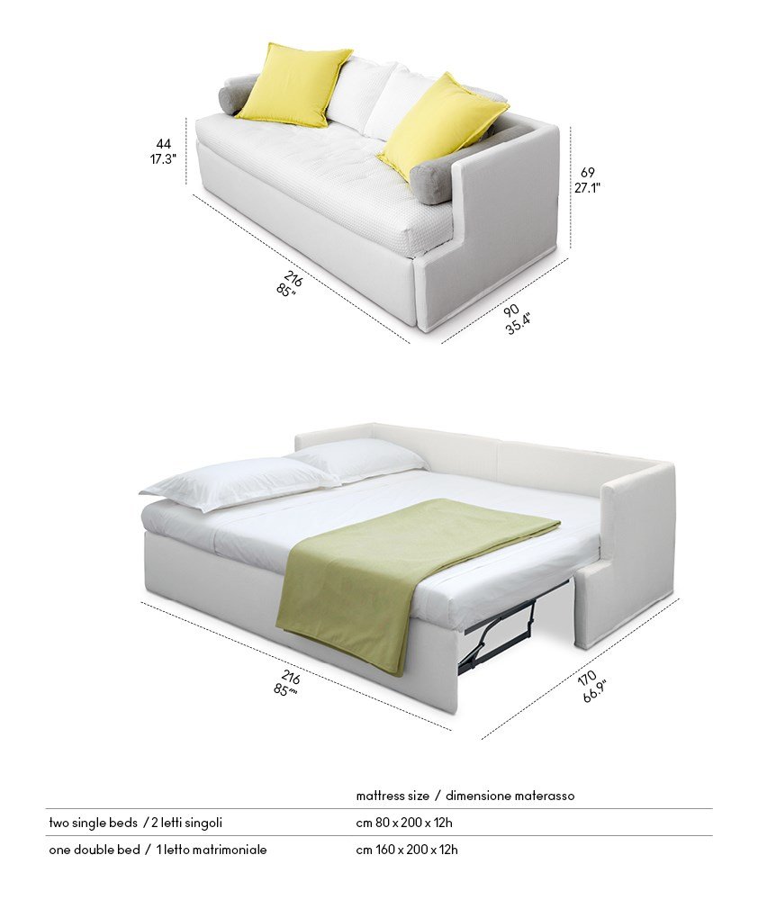 La struttura lineare, le proporzioni equilibrate e i volumi generosi definiscono un profilo contemporaneo, valorizzato da rivestimenti tessili di alta qualità e cuciture sartoriali. La seduta accogliente e i cuscini morbidi assicurano un comfort impeccabile sia nella versione giorno che in quella notte.