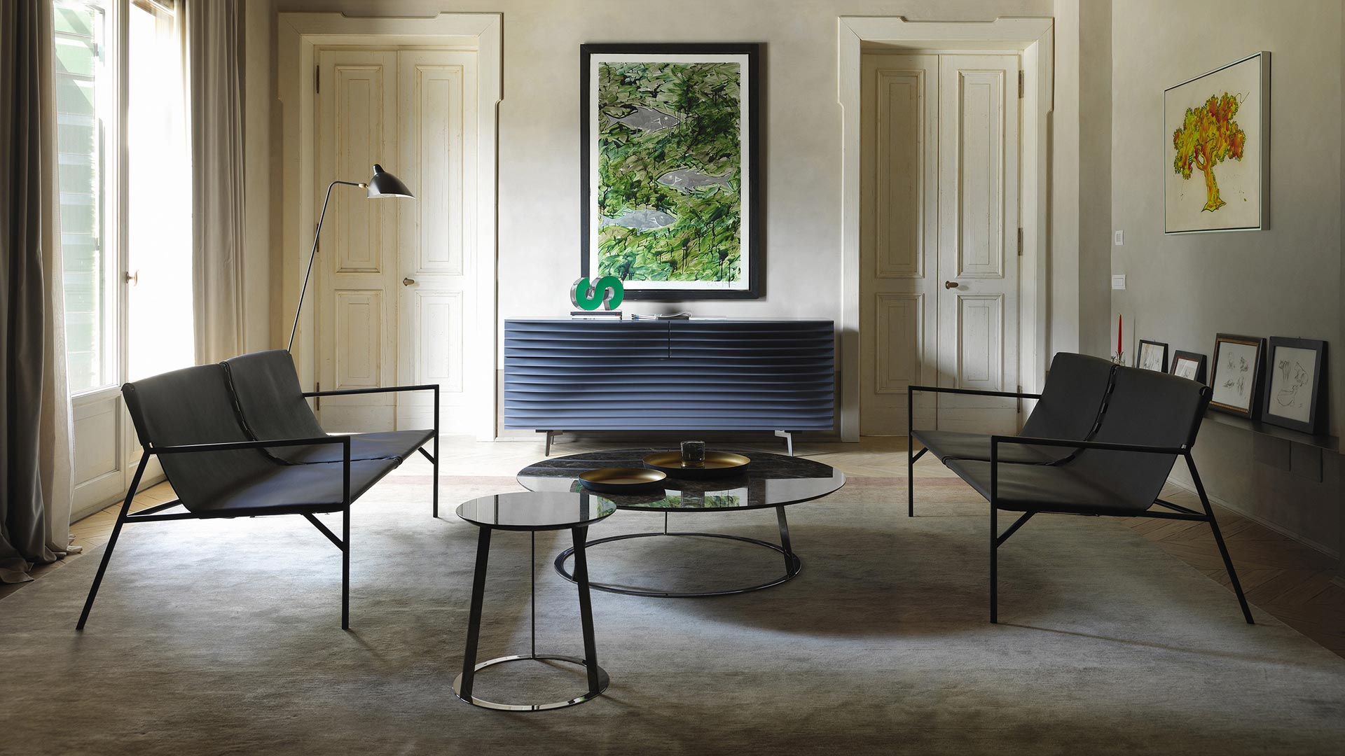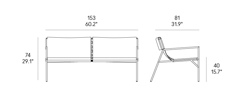 Il particolare sistema di giunzione tra i moduli, realizzato con cinghie in cuoio, esprime la cura artigianale e la precisione costruttiva che caratterizzano la collezione.