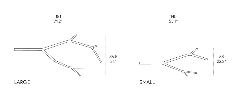 Aira è una sospensione scultorea che trasforma la luce in un segno poetico. Composta da due elementi di dimensioni differenti, presenta una struttura in ottone verniciata oro che evoca la naturale eleganza di un ramo d’albero sospeso nello spazio. L’effetto è di straordinaria leggerezza: un equilibrio visivo tra forma organica e precisione costruttiva, dove ogni linea diventa gesto luminoso.