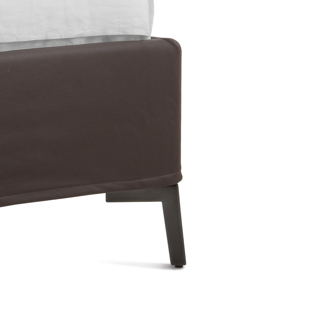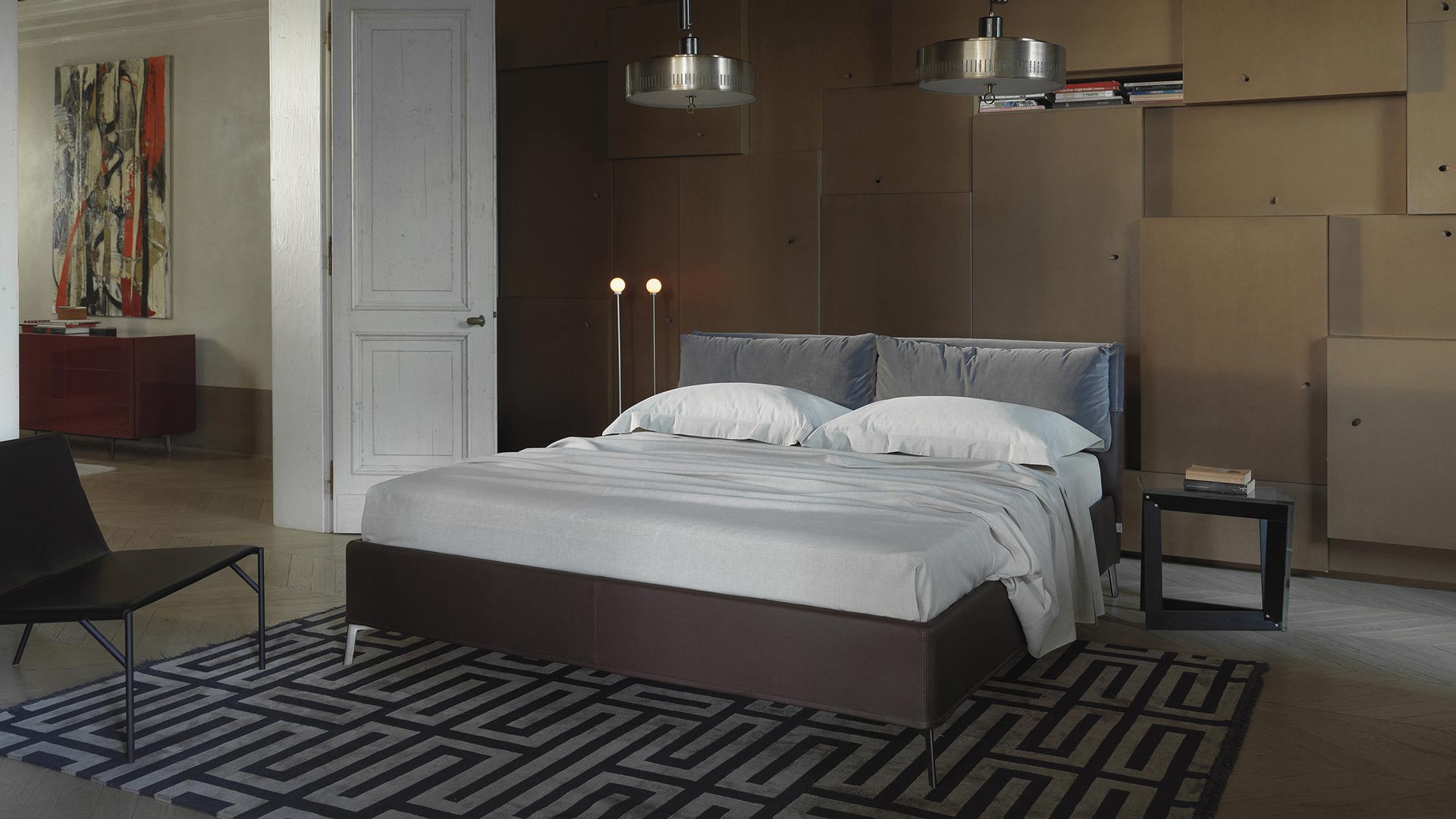 La testiera, morbida e sottile, suggerisce un comfort misurato e sofisticato, mentre la base imbottita, rivestita in tessuto o pelle, valorizza la lavorazione sartoriale che distingue ogni creazione Horm. I piedini sottili, in metallo, alleggeriscono il volume e donano al letto un equilibrio visivo di grande modernità, ispirato al design degli anni Cinquanta.