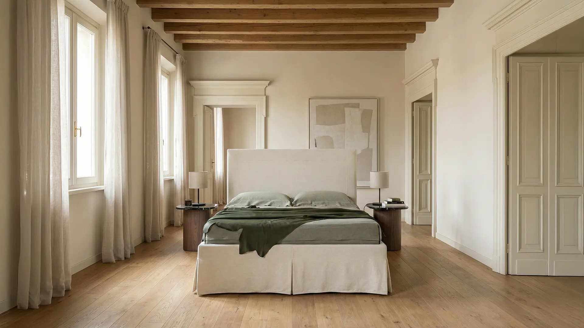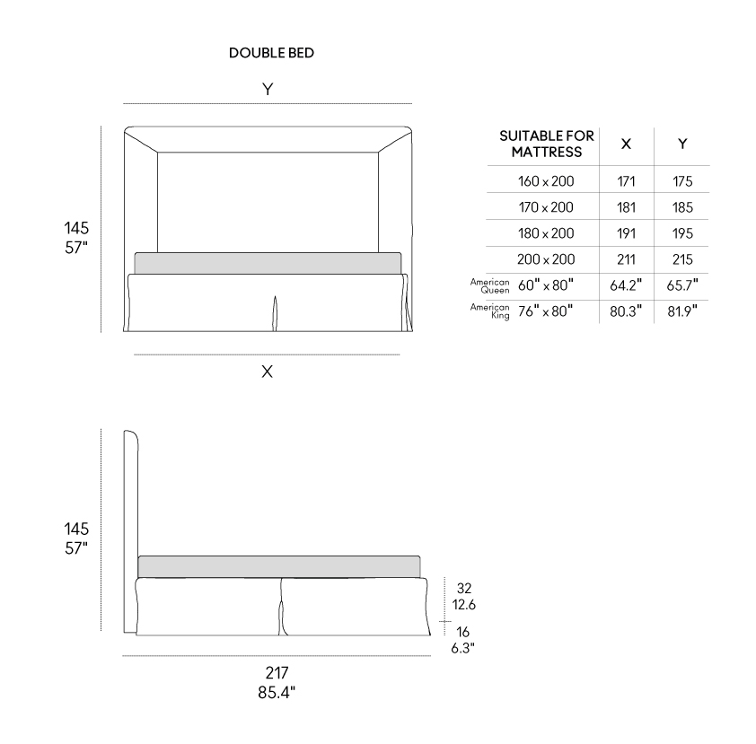 Sardegna interpreta il letto tessile con un linguaggio raffinato e misurato, dove la semplicità delle forme incontra un’eleganza intramontabile. La sua testiera, ampia e perfettamente lineare, è definita da una cucitura sartoriale che ne sottolinea il profilo come la cornice di un quadro: un dettaglio che le conferisce una presenza elegante e architettonica, trasformandola in un elemento decorativo che incornicia il riposo con equilibrio e leggerezza.