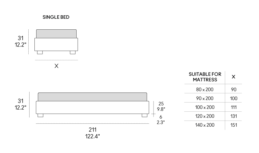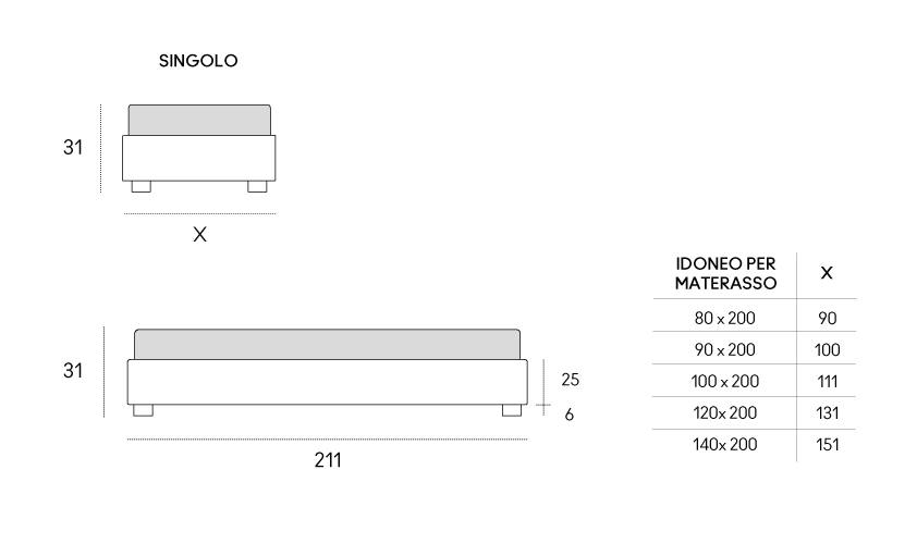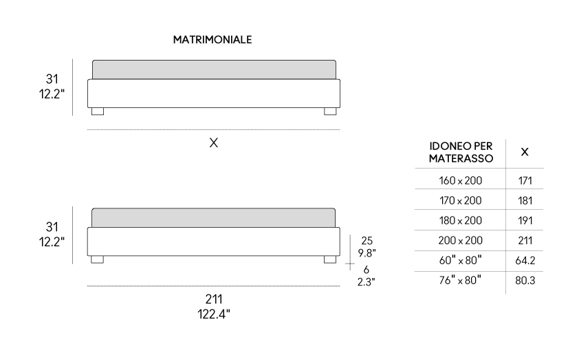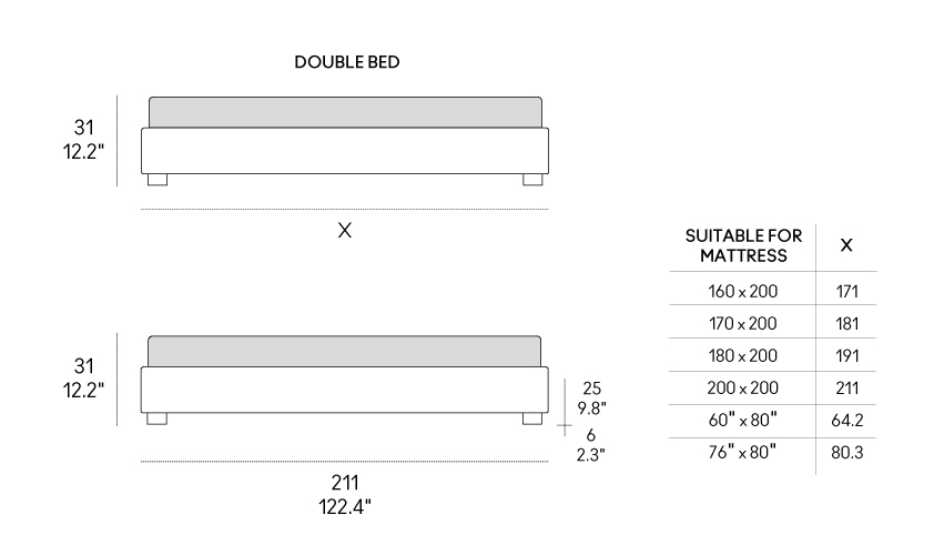 Letto con rivestimento sfoderabile in tessuto, ecopelle o pelle. Struttura in pannelli di particelle di legno imbottiti in poliuretano espanso e rivestiti in tessuto protettivo accoppiato. Rete a doghe con telaio in acciaio 51×49 mm verniciato a polveri atossiche, colore grigio quarzo. Doghe in multistrato di faggio da 68 mm. Doppie doghe centrali nella zona lombare con cursori di regolazione della rigidità. Spessore doghe 8 mm. Piedini in legno di faggio massello tinto moca.