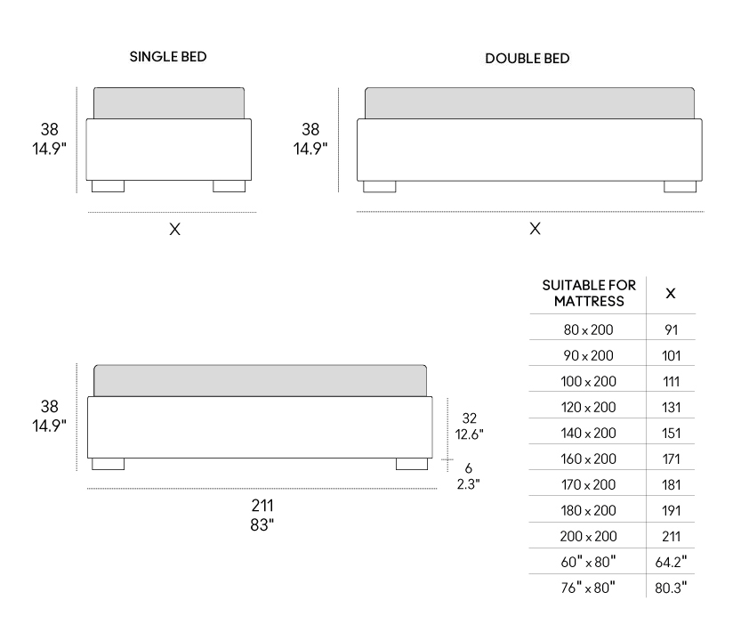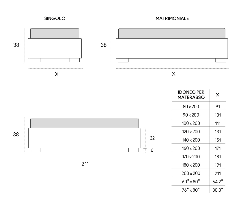 Letto con rivestimento sfoderabile in tessuto o ecopell. Struttura in pannelli di particelle di legno imbottiti in poliuretano espanso e rivestiti in tessuto protettivo accoppiato. Rete a doghe con telaio in acciaio 51×49 mm verniciato a polveri atossiche, colore grigio quarzo. Doghe in multistrato di faggio da 68 mm. Doppie doghe centrali nella zona lombare con cursori di regolazione della rigidità. Spessore doghe 8 mm. Piedini in materiale termoplastico.