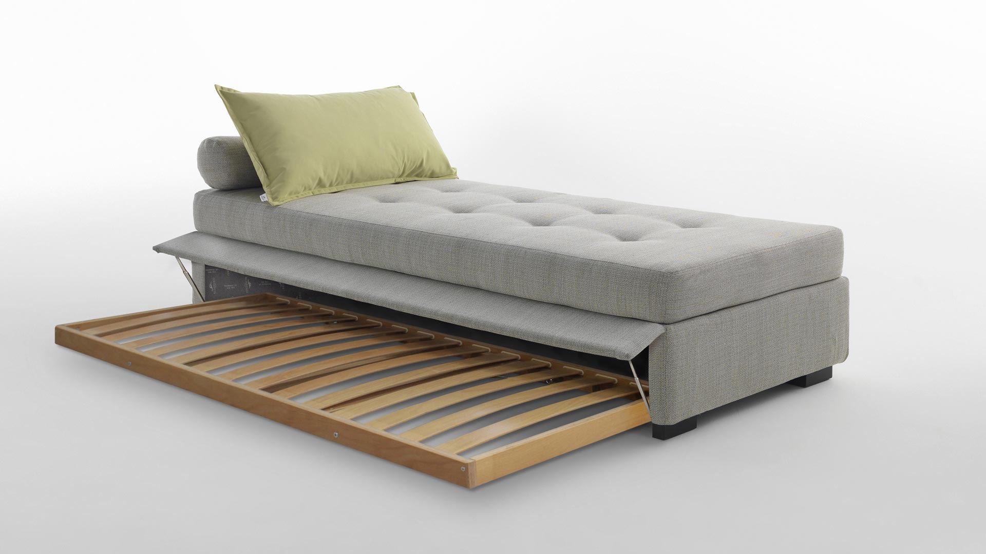 Un letto singolo dal design essenziale, dotato di un secondo letto estraibile nascosto alla base, che si apre con semplicità trasformando la stanza con un gesto.