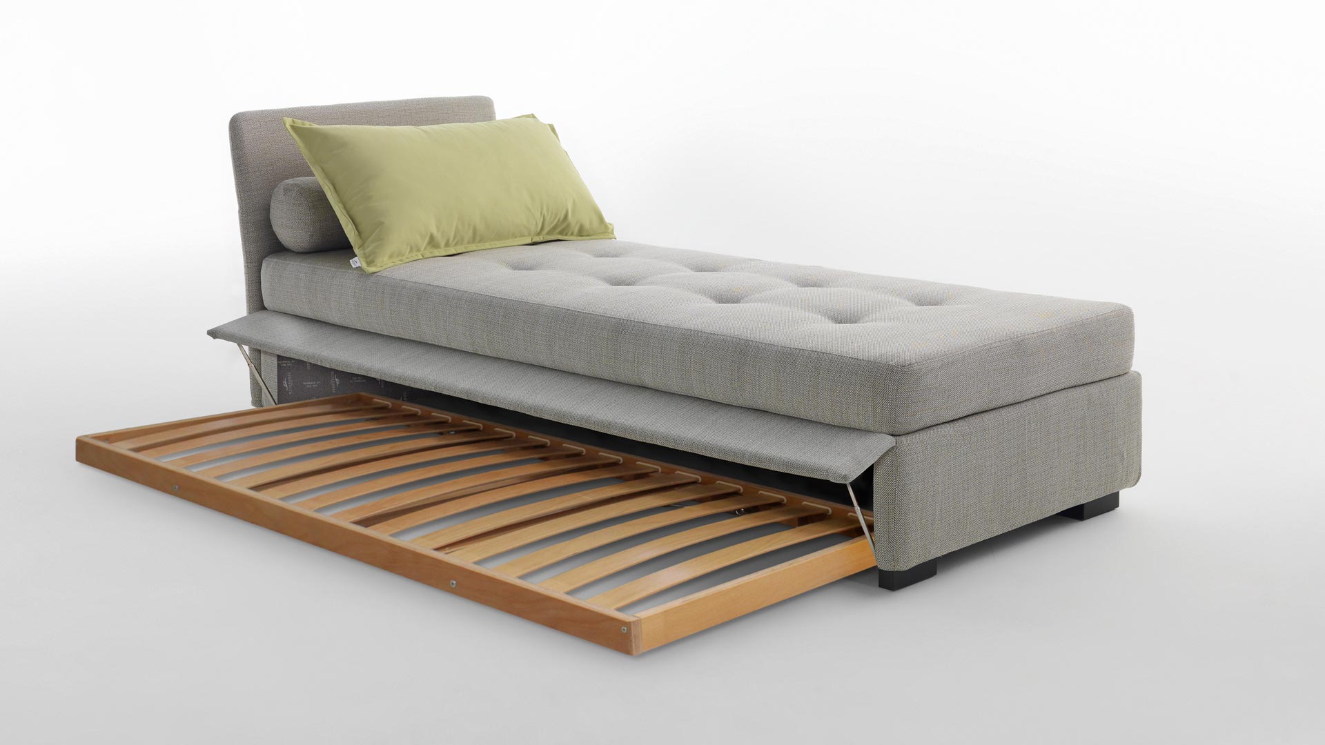 La rete estraibile, interamente realizzata in legno massello con doghe di faggio curvato, assicura la stessa qualità del letto principale, garantendo robustezza, comfort e durata nel tempo. Un dettaglio che conferma l’eccellenza costruttiva e l’autenticità artigianale del design Made in Italy.