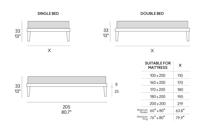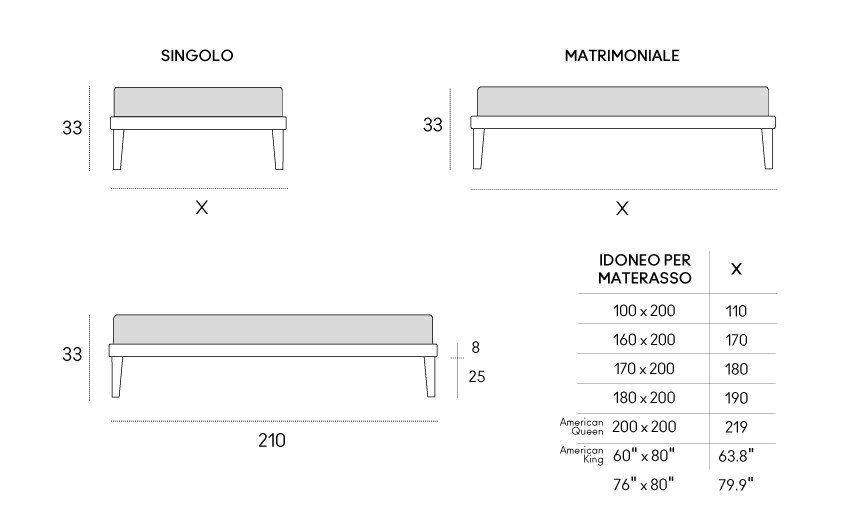 Letto con rivestimento sfoderabile in tessuto, ecopelle o pelle. Struttura in multistrato e pannelli di particelle di legno imbottiti in poliuretano espanso e rivestiti in tessuto protettivo accoppiato. Rete a doghe con telaio in acciaio 51×49 mm verniciato a polveri atossiche, colore grigio quarzo. Doghe in multistrato di faggio da 68 mm. Doppie doghe centrali nella zona lombare con cursori di regolazione della rigidità. Spessore doghe 8 mm. Piedini in legno di faggio massello tinto moca.