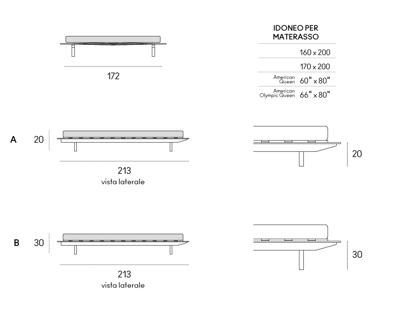 Il design si completa con piedi squadrati disponibili in due altezze e una testiera sottile e armoniosamente curvata, che conferisce equilibrio e dinamismo all’insieme.