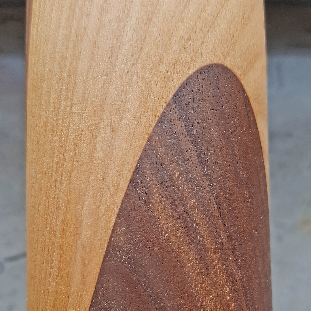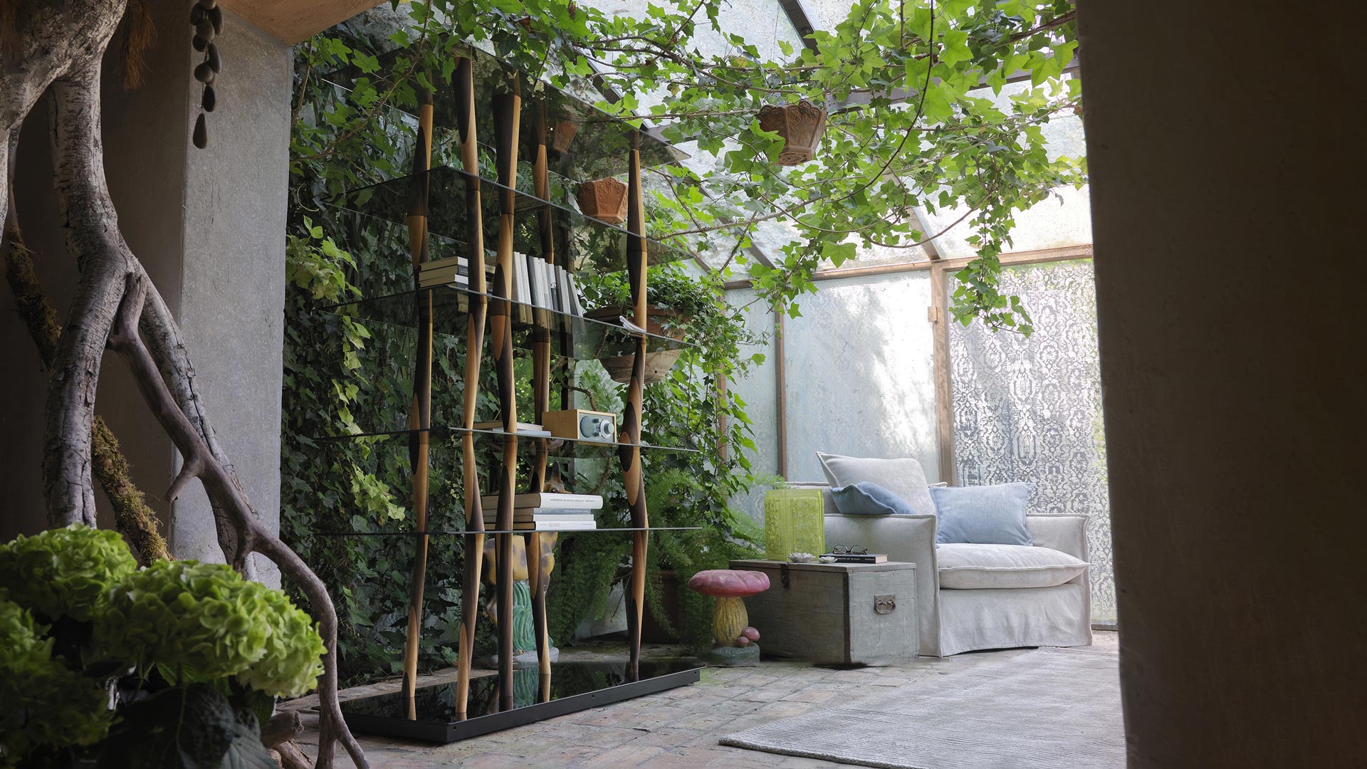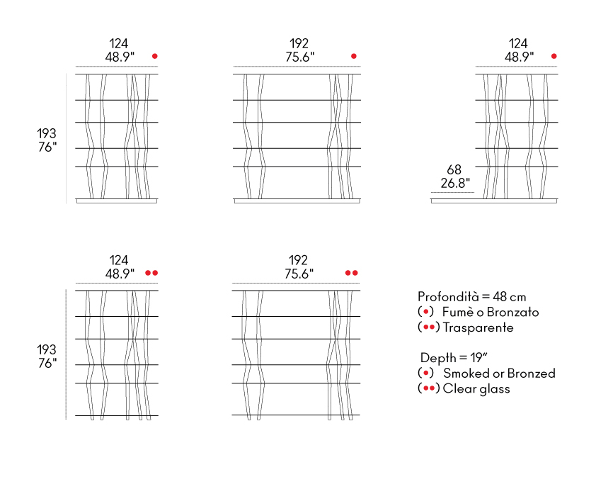 La struttura si compone di sei ripiani in vetro disponibili in tre finiture — trasparente, fumé e bronzato — sorretti da elementi torniti in legno massello di noce e ontano, ciascuno differente per inclinazione e sezione.