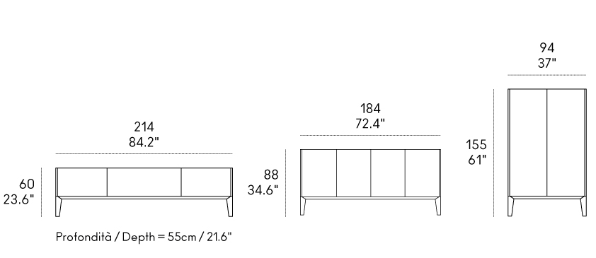 Le superfici verticali in legno nascondono un ampio spazio interno suddiciso in tre compartimenti da due mensole in vetro, perfetto per custodire oggetti o biancheria con ordine e discrezione. La base in metallo conferisce al mobile un carattere architettonico e un senso di sospensione dal pavimento.