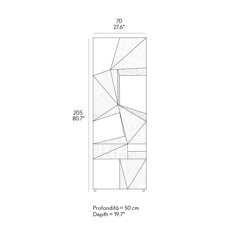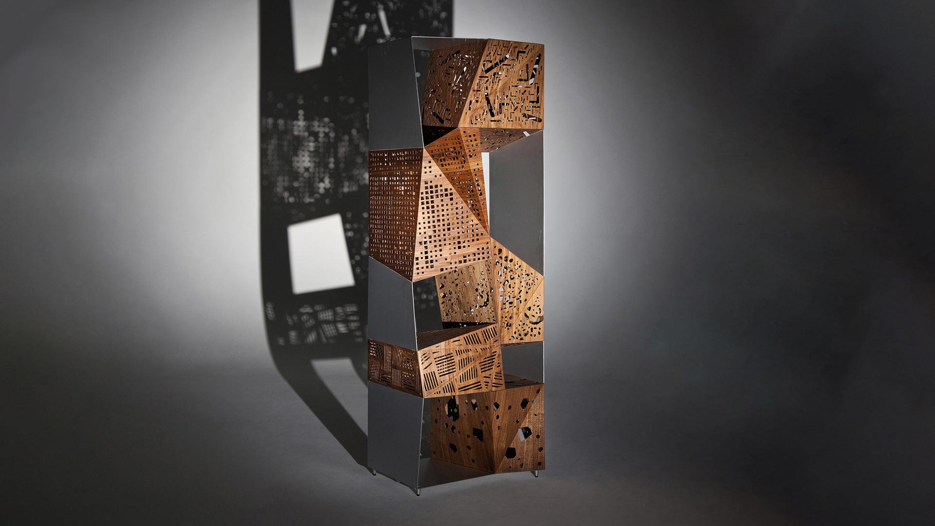 Riddled Totem eleva la materia a pura architettura. La struttura, in alluminio verniciato e legno di noce canaletto inciso al laser, si compone di cinque vani con ante apribili tramite chiusura magnetica.