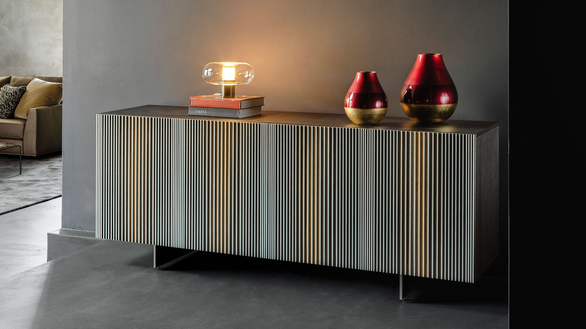 I frontali, lavorati con cura artigianale, sono pensati come superfici in continuo divenire. La luce e lo sguardo ne trasformano i colori e le profondità, restituendo vibrazioni che cambiano istante dopo istante. È un mobile che si anima di riflessi, capace di sorprendere e catturare come un’opera cinetica all’interno dello spazio domestico.