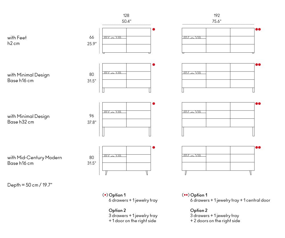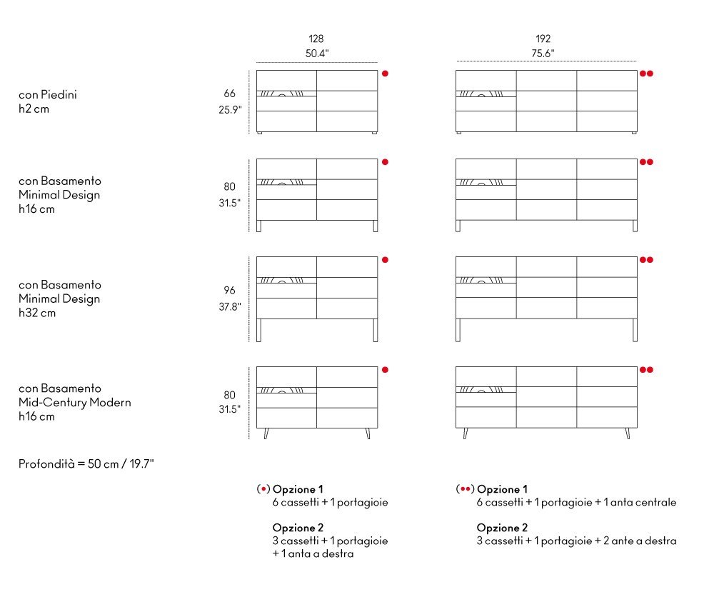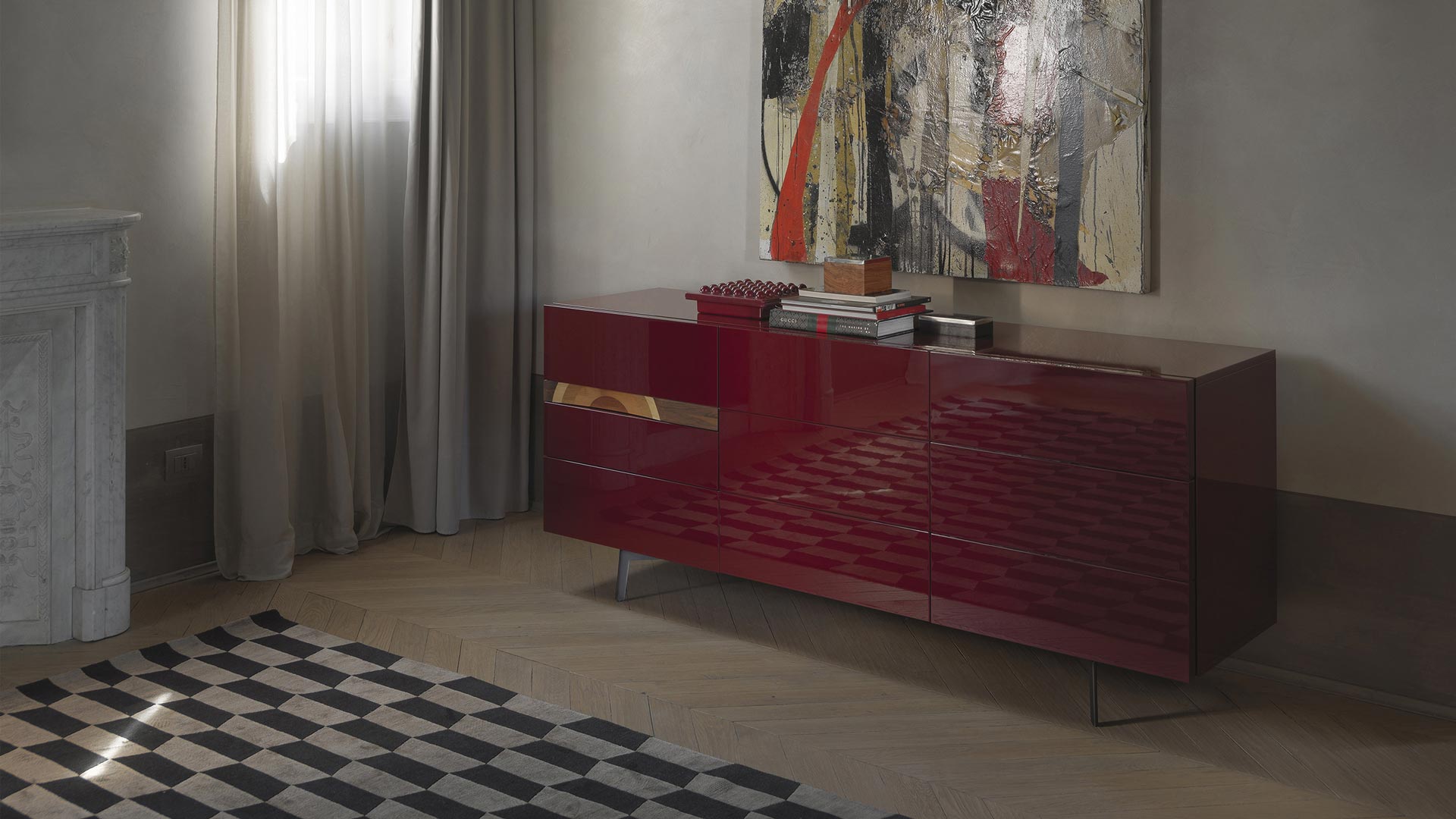 Le gambe metalliche, dal profilo sottile e ispirate al design modernista degli anni ’50 e ’60, sollevano la struttura con un gesto discreto ma deciso, donando equilibrio e slancio visivo all’intero arredo. I frontali lineari sono interrotti da un raffinato inserto in legno multistrato, realizzato a mano con cinque essenze naturali — noce, mogano, ciliegio, rovere e acero — che introduce un segno caldo e vibrante nella composizione.