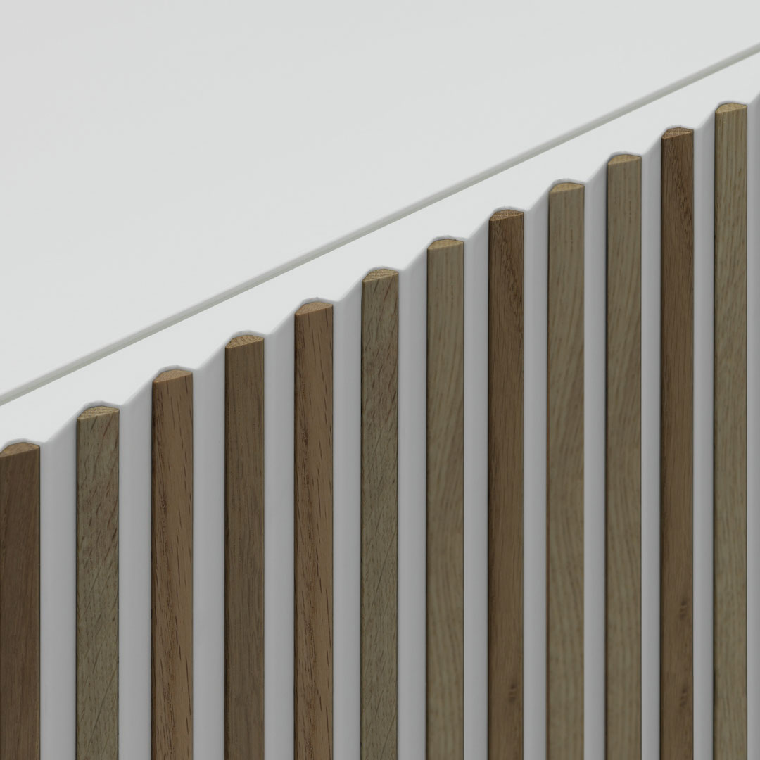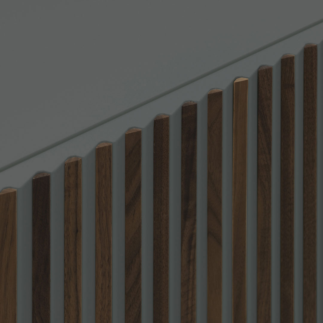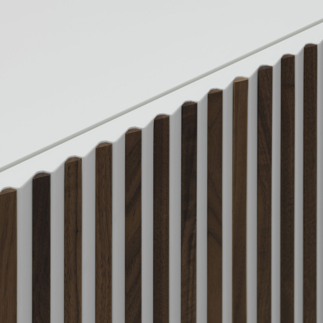 I listelli di legno sul frontale e le campiture laccate di Leon Decor generano un cambio di colore intuitivo: guardandolo da destra prevale il corpo laccato, da sinistra spiccano i decori in essenza, come un piccolo esperimento di percezione da vivere ogni giorno. La composizione rimane ordinata, ma mai statica: è un accento sofisticato per interni contemporanei che cercano rigore, versatilità e identità visiva.