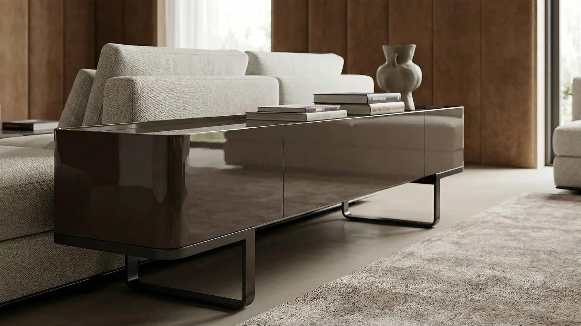 Pensato per sale da pranzo e zone living, si presta anche come madia porta TV o piano d’appoggio frontale al divano, in spazi dove estetica e comfort convivono con naturalezza.