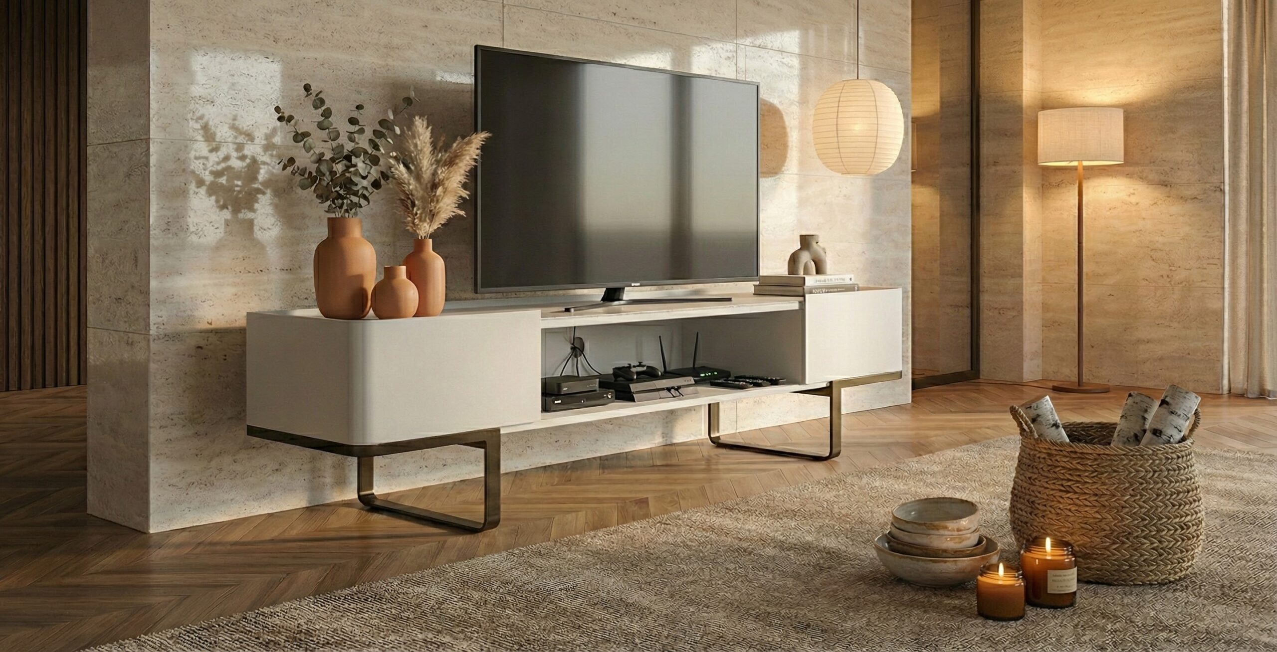 Il vano centrale aperto accoglie con discrezione apparecchi multimediali, mentre due cassetti laterali offrono spazio per organizzare accessori e oggetti d’uso quotidiano.