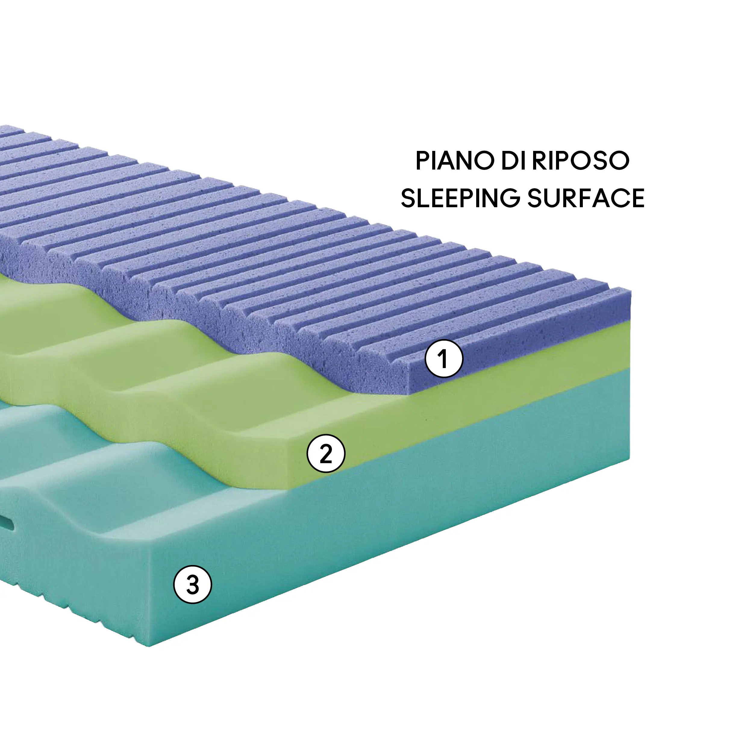 (3) > Piano di riposo in Eco-TPU h 8 cm, con densità 35 kg/m³. Costituisce la base più sostenuta della struttura (Firm), garantendo stabilità, supporto profondo e una risposta progressiva ai carichi.