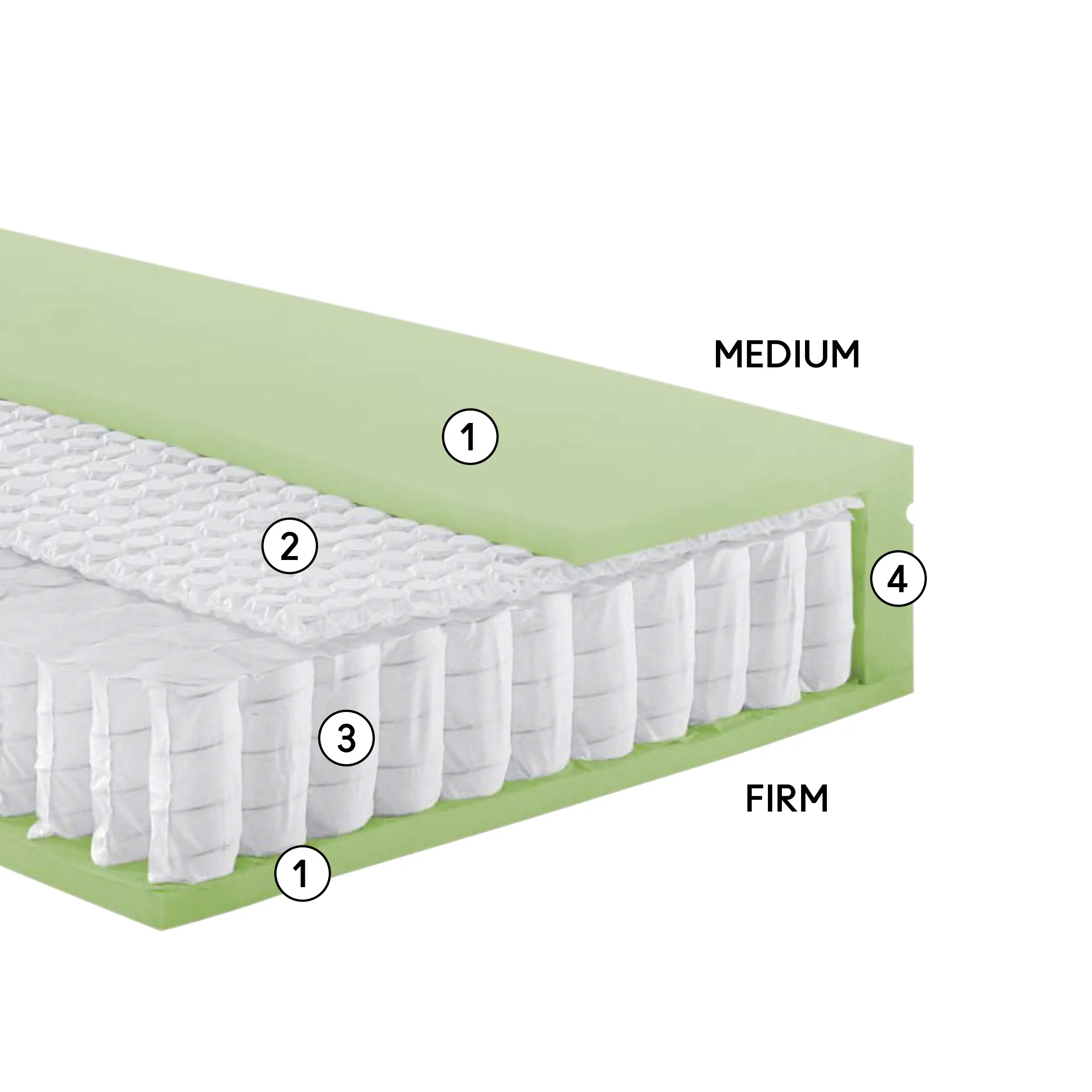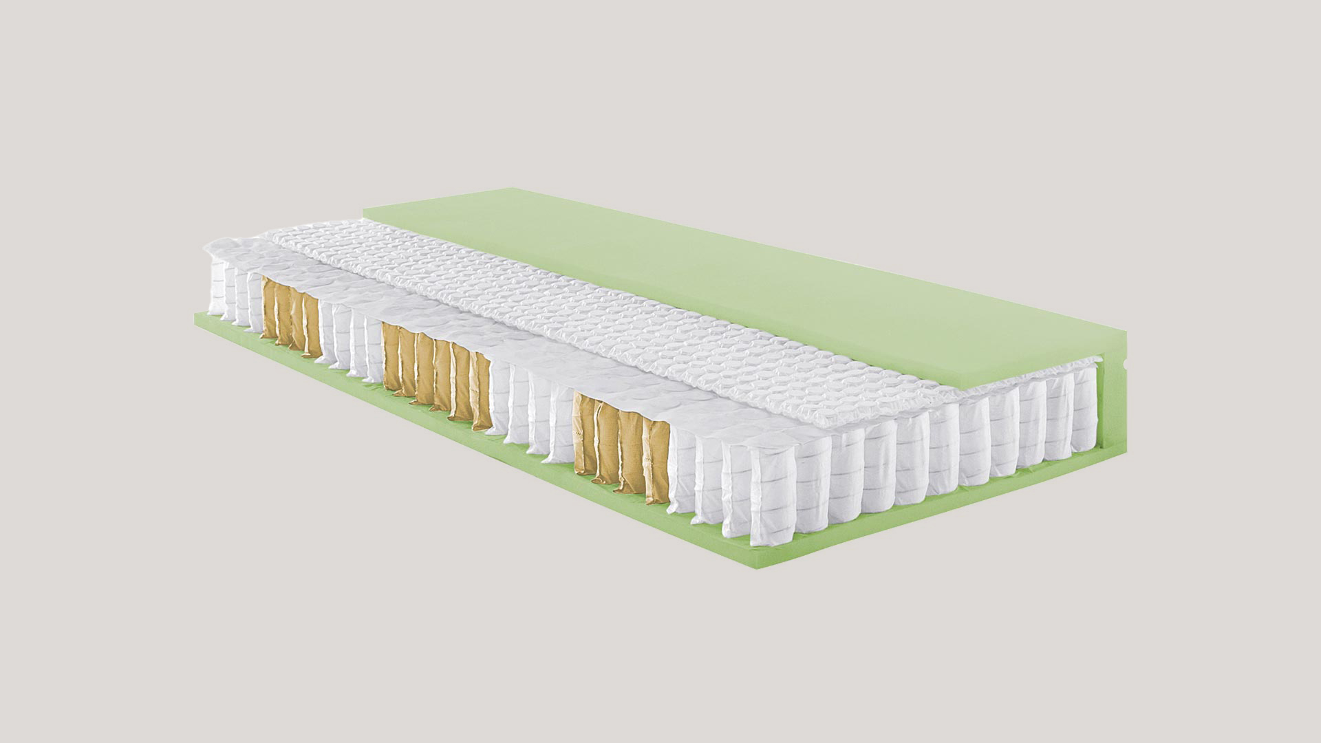 (3) > 800 molle indipendenti (nella versione matrimoniale) a 7 zone di portanza differenziata. Il secondo livello di molle funziona come vero sistema ergonomico: sostiene in modo più deciso le zone lombare e dorsale, mentre accoglie con maggiore delicatezza spalle e bacino. La doppia struttura di molle garantisce un supporto equilibrato e progressivo.