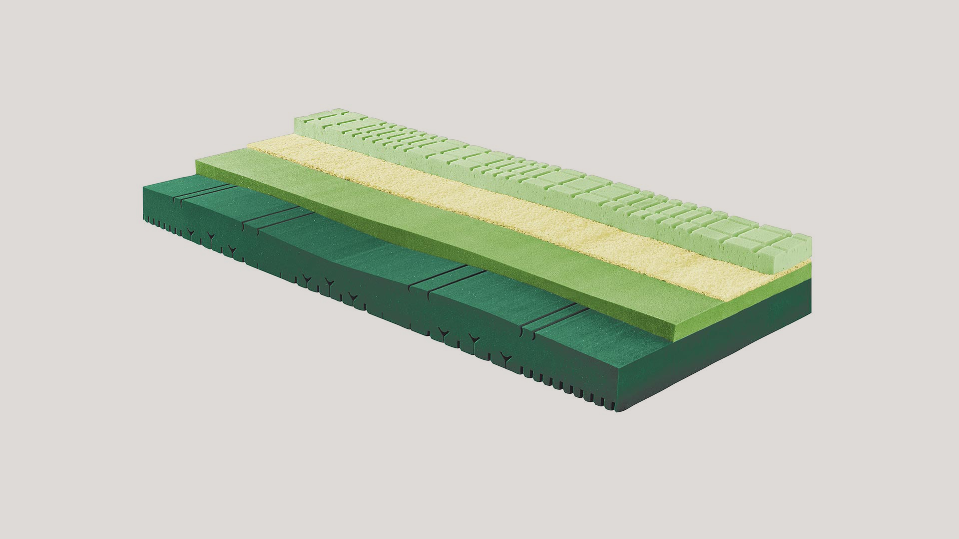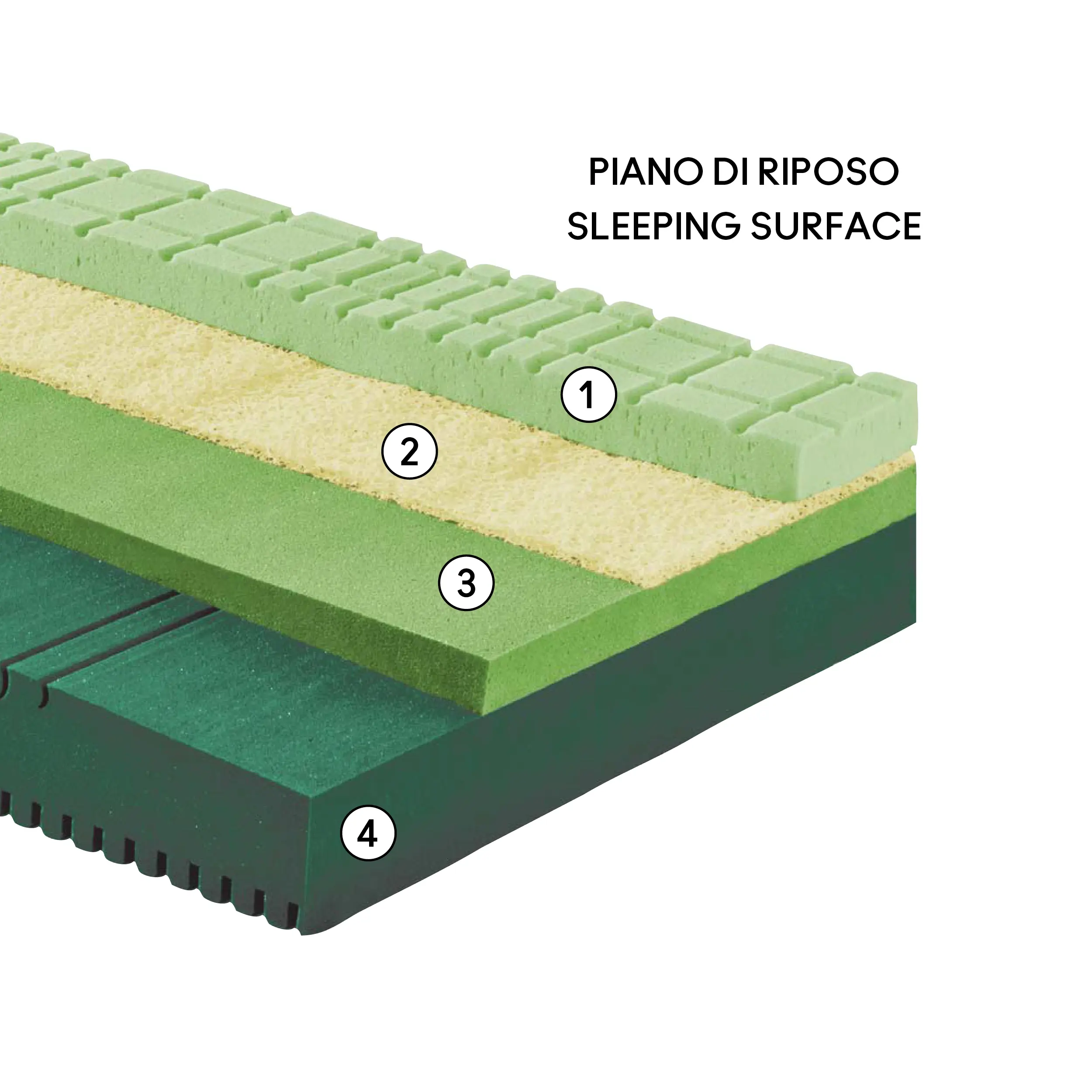 (4) > Strato di supporto in Elast-tec®, densità 38 kg/m³ (firm). Costituisce la base portante della struttura, assicurando stabilità, sostegno profondo e una risposta elastica duratura nel tempo.