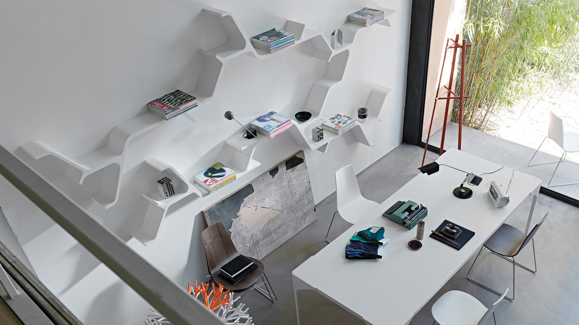 Sinapsi è una mensola singola che diventa un sistema modulare grazie alla sua forma organica e dinamica.