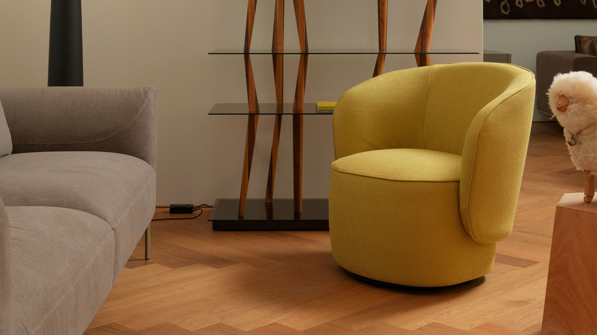La poltrona girevole Étoile è un inno all’eleganza più intima e personale, con volumi calibrati e un design che avvolge il corpo invitando a momenti di meditazione e convivialità.
