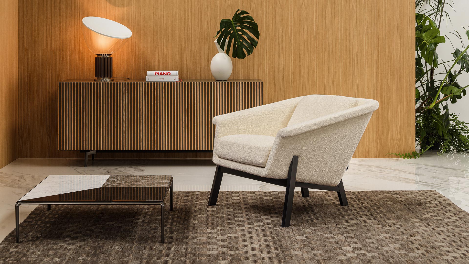 Il supporto in legno, ispirato alle linee scandinave degli anni Settanta, dialoga con una scocca dalle forme morbide e contemporanee, creando un equilibrio armonico tra tradizione e modernità.