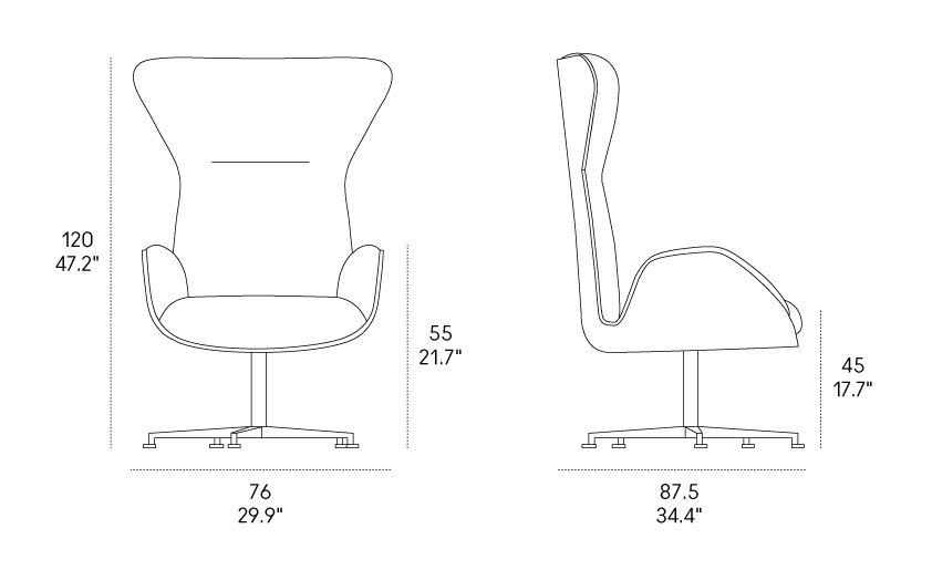 La poltrona può essere rivestita in versione monocolore oppure con colori o materiali differenti tra fronte e retro, per creare raffinati contrasti cromatici o tattili.