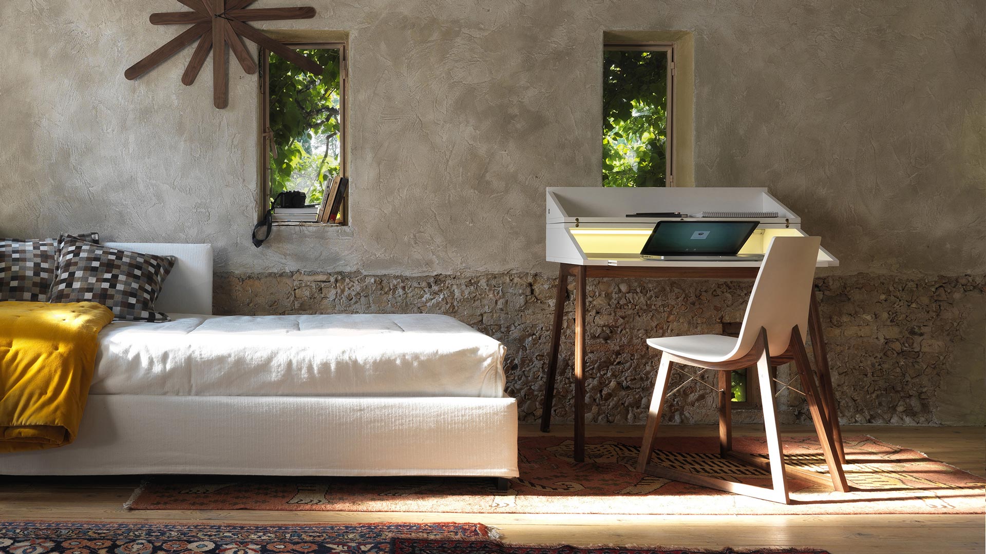 La sua anta ribaltabile consente di trasformarlo, con un semplice gesto, da postazione operativa a consolle raffinata e compatta, celando al suo interno documenti e oggetti personali. Un equilibrio perfetto tra funzionalità e riservatezza, che permette di mantenere gli ambienti sempre ordinati e armoniosi.
