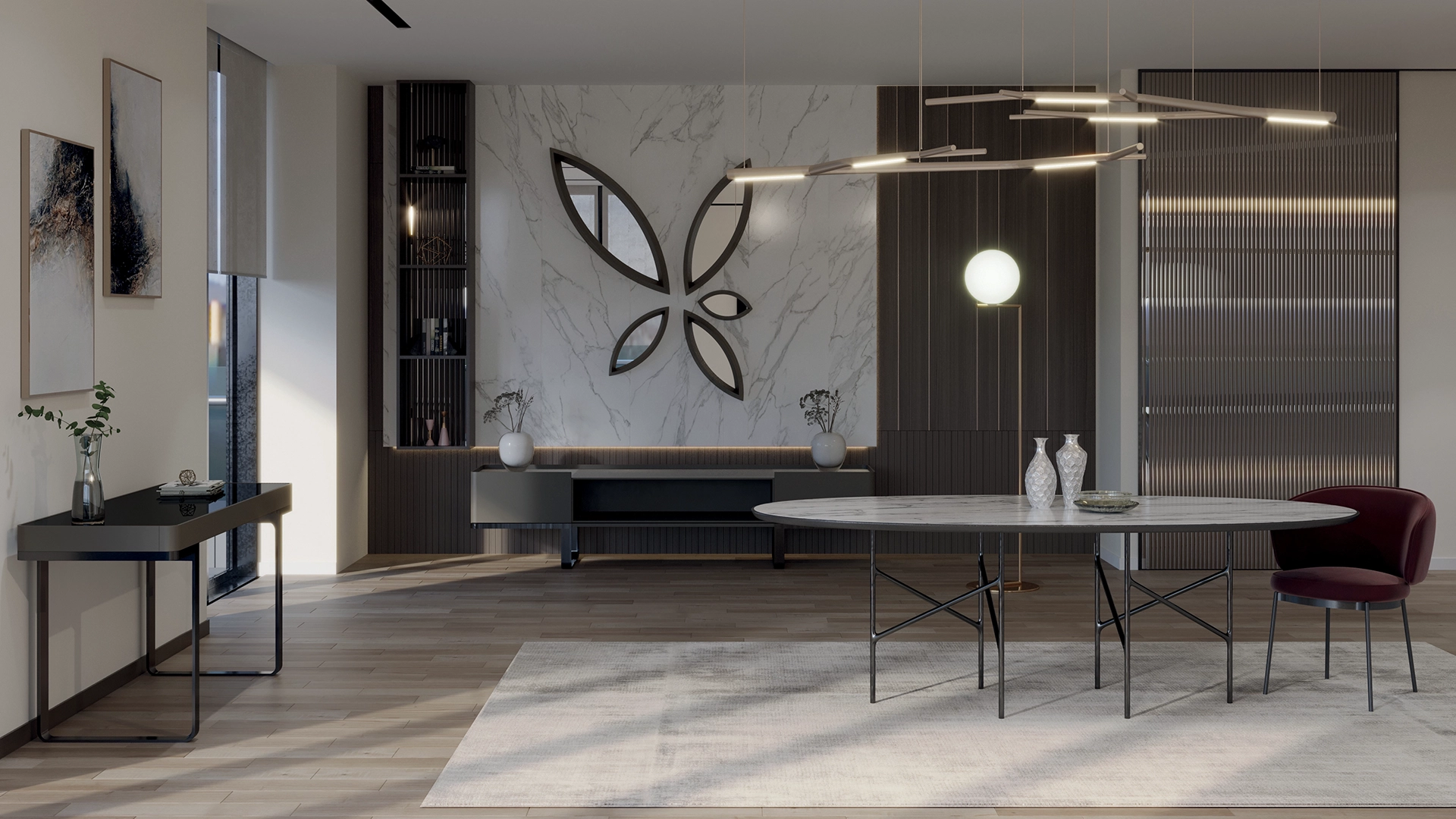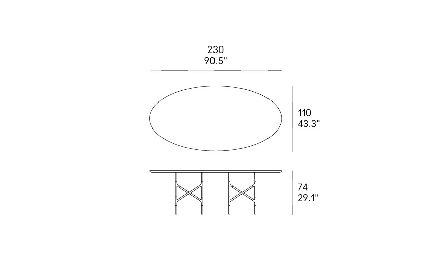 Nella versione ovale, Alexander esprime un’eleganza fluida e conviviale. La base in metallo, composta da gambe sottili collegate da giunti a Y, conferisce dinamismo e stabilità, mentre il piano — disponibile in marmo, Fenix o vetro retroverniciato — introduce una dimensione più morbida e accogliente alla geometria del tavolo.