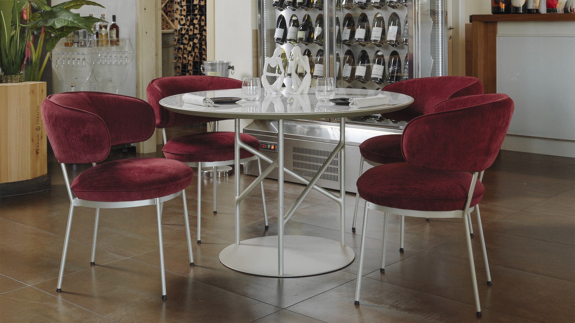 Alexander nella versione rotonda diventa il fulcro naturale di ogni ambiente. La struttura in metallo, leggera ma solida, sostiene un piano perfettamente proporzionato disponibile in marmo, Fenix o vetro retroverniciato, offrendo una superficie ideale per l’incontro e la condivisione.