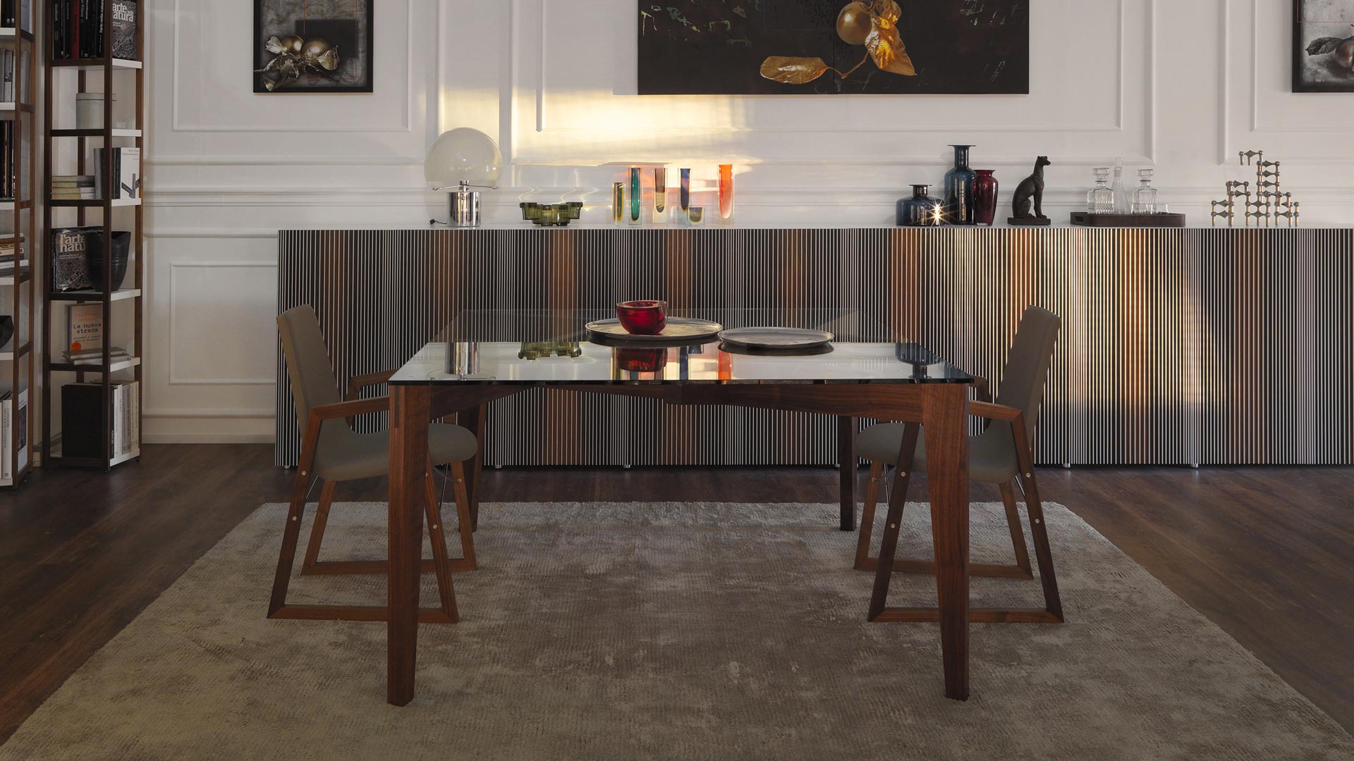 Il piano in vetro temperato lascia intravedere il raffinato intreccio sottostante, enfatizzando la precisione geometrica e la qualità artigianale delle lavorazioni. La trasparenza della superficie esalta la matericità del legno, creando un dialogo costante tra leggerezza e solidità.