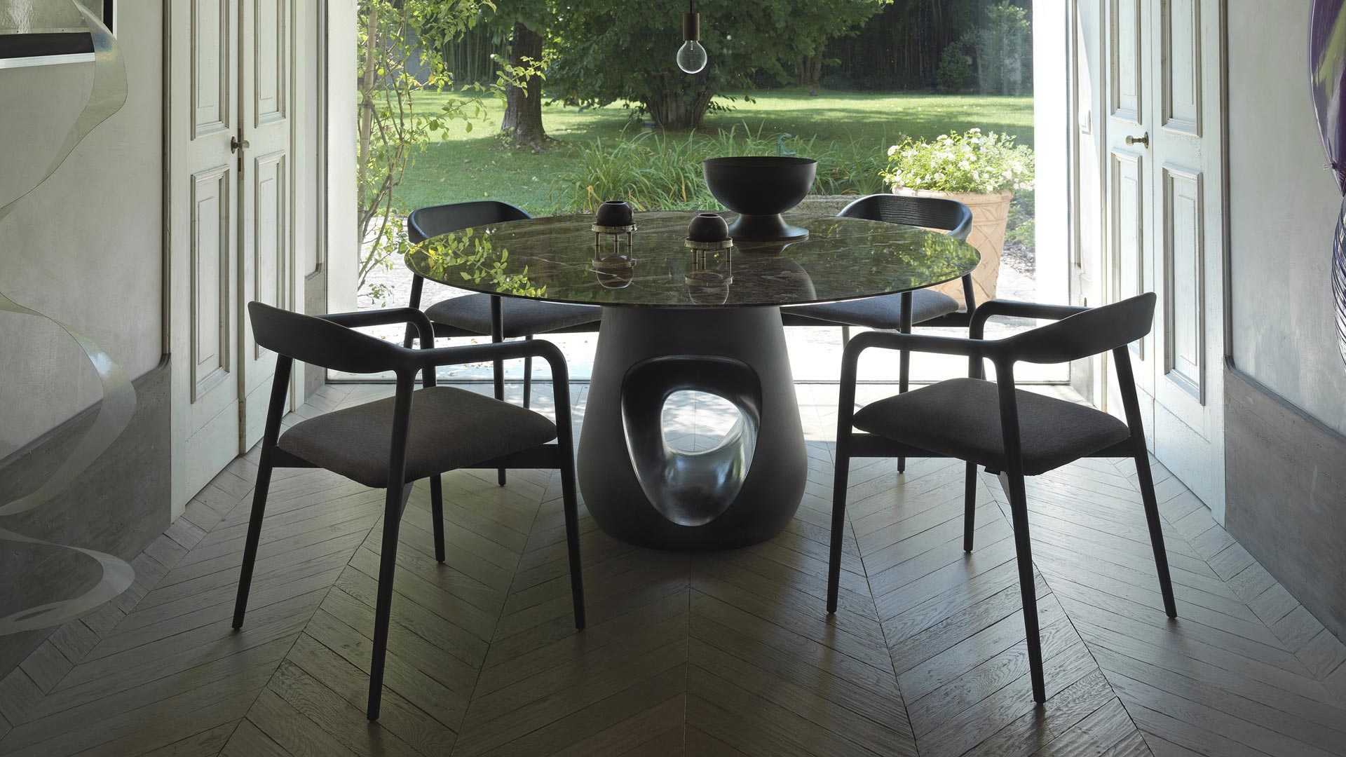 L’ispirazione arriva dal linguaggio artistico di Barbara Hepworth, capace di trasformare la materia in emozione. Il tavolo diventa così una presenza architettonica e poetica al tempo stesso, in cui i marmi pregiati riflettono la luce con sfumature profonde, mentre il cemento ne sottolinea la solidità e la purezza costruttiva.