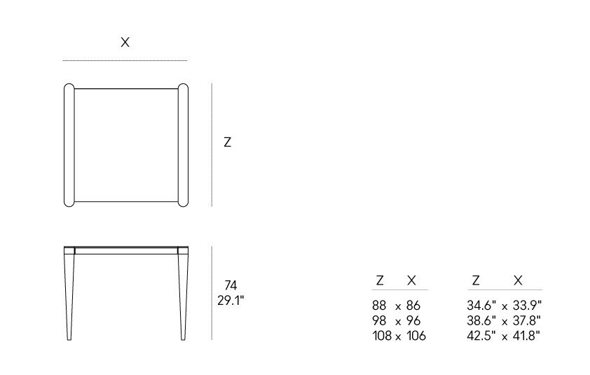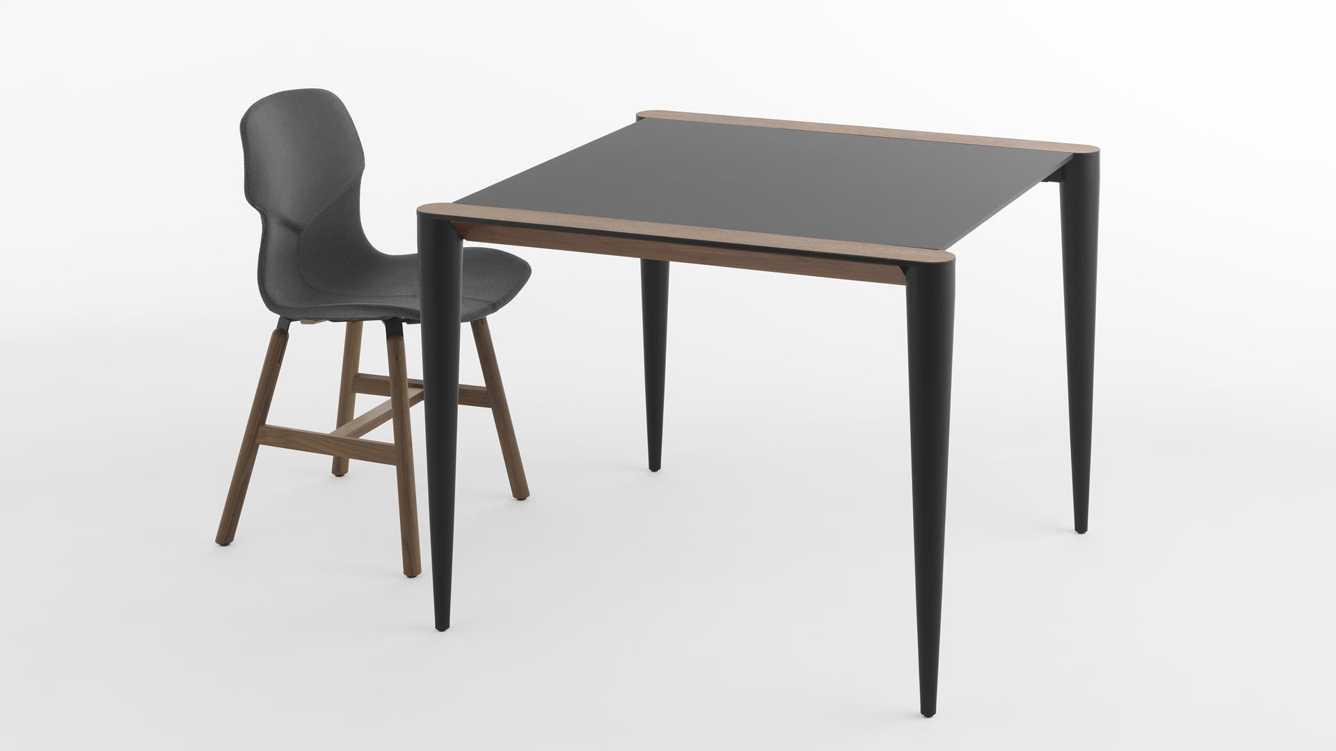 Il piano quadrato, sostenuto da gambe coniche in metallo, definisce un equilibrio armonico di proporzioni che si adatta con naturalezza a spazi contract, piccoli ambienti residenziali o zone dining metropolitane.