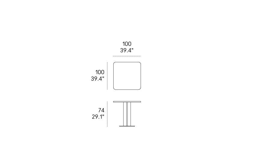 Trafalgar nella versione quadrata interpreta il design iconico del modello rettangolare in una scala più intima e versatile, ideale per ristoranti, boutique hotel o raffinati ambienti domestici. Le proporzioni compatte non rinunciano alla forza scultorea che caratterizza la collezione: il top, definito da angoli dolcemente raggiati e dal bordo perimetrale continuo, disegna una geometria precisa e accogliente, capace di donare equilibrio visivo e comfort d’uso.