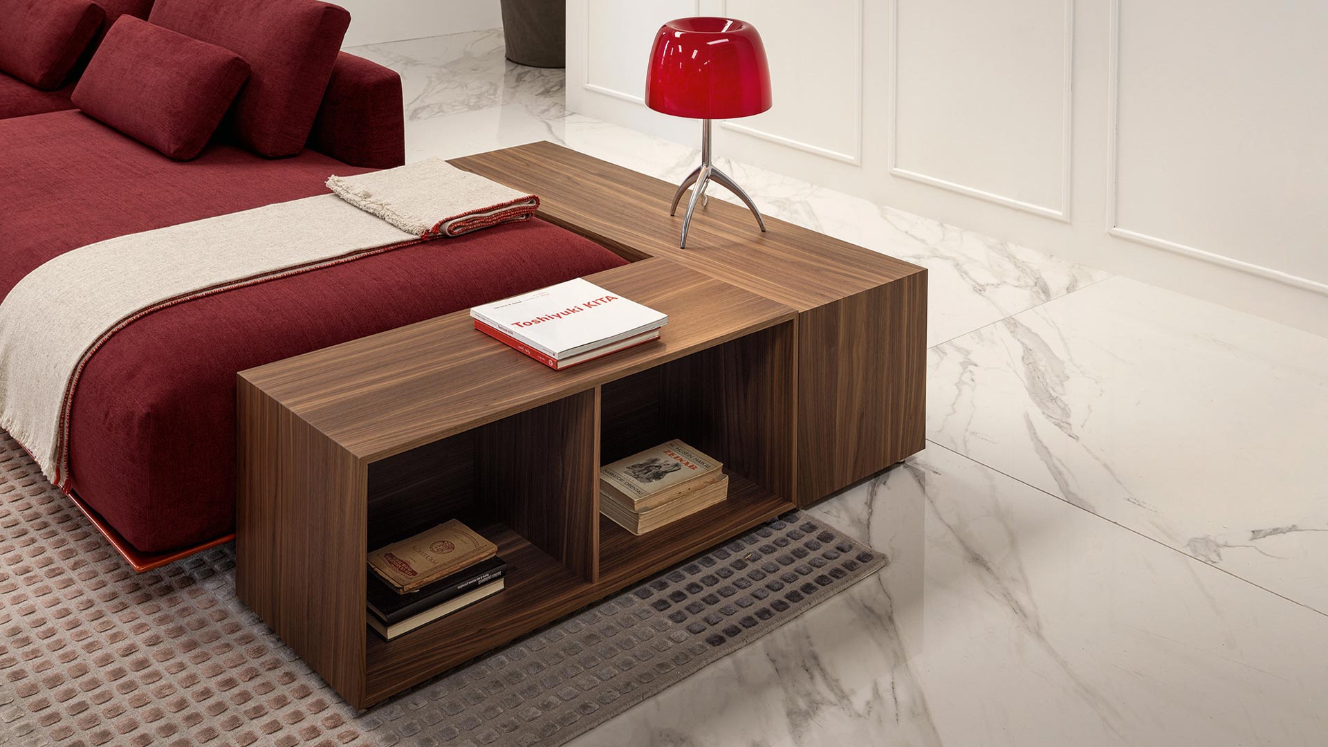 La sua struttura in legno, dalle proporzioni rigorose e contemporanee, può essere collocata accanto o dietro al divano, diventando di volta in volta piano d’appoggio, libreria o elemento di connessione tra gli spazi.