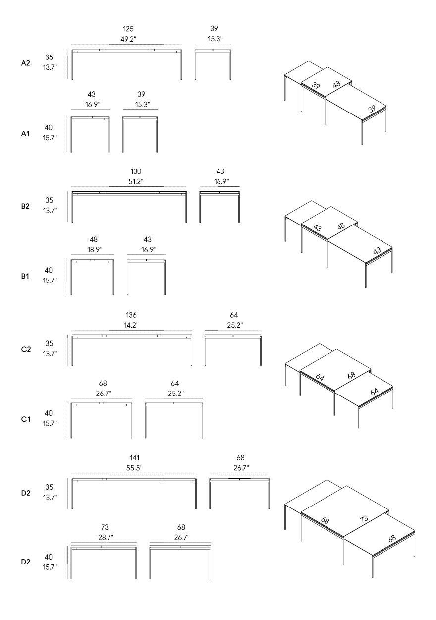Il piano sottile sembra fluttuare nel vuoto, mentre le diverse altezze e proporzioni permettono combinazioni dinamiche di incastri e sovrapposizioni, capaci di adattarsi con eleganza a contesti domestici e contract.